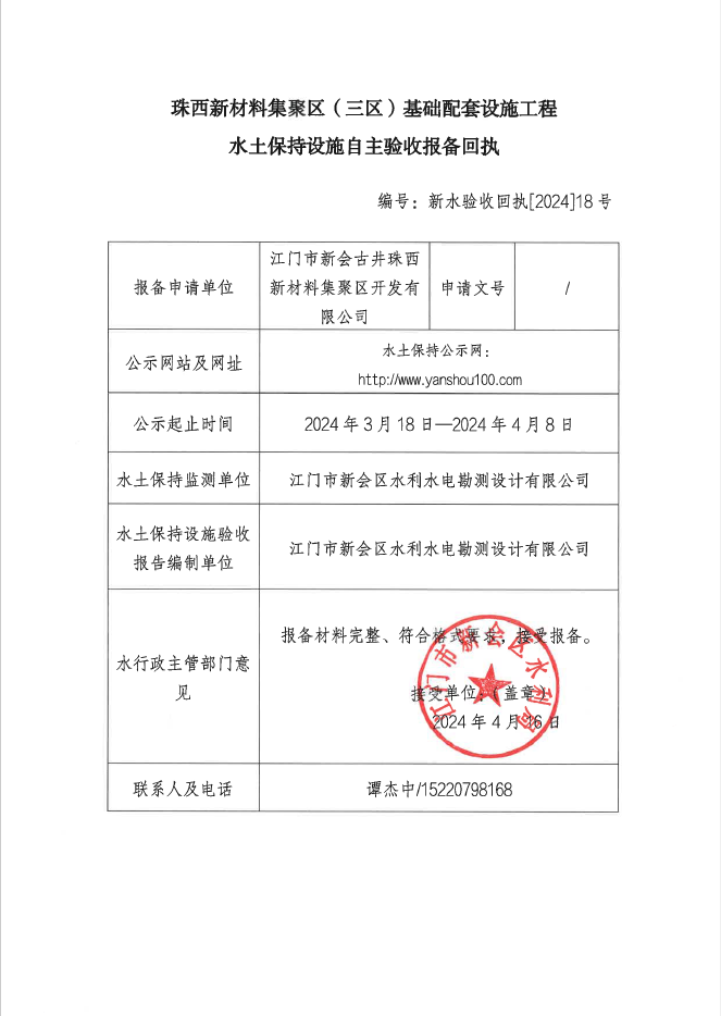 珠西新材料集聚区(三区)基础配套设施工程水土保持设施自主验收报备回执