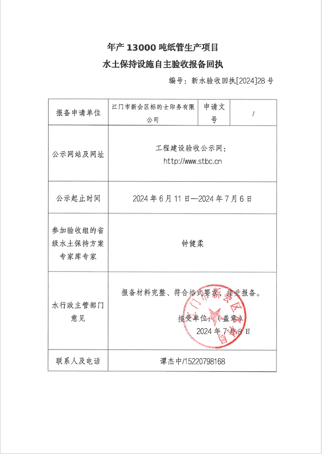 年产13000吨纸管生产项目水土保持设施自主验收报备回执