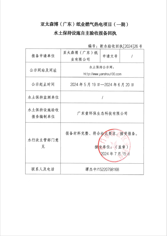 亚太森博(广东)纸业燃气热电项目(一期) 水土保持设施自主验收报备回执