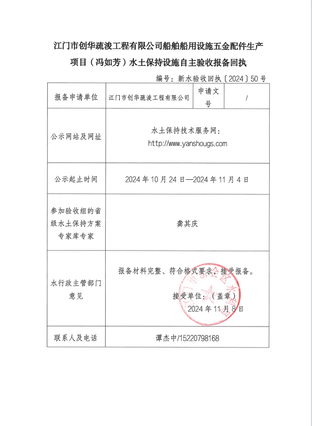 江门市创华疏浚工程有限公司船舶船用设施五金配件生产项目(冯如芳)水土保持设施自主验收报备回执