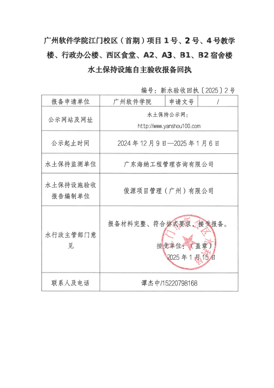 广州软件学院江门校区(首期)项目1号、2号、4号教学楼、行政办公楼、西区食堂、A2、A3、B1、B2宿舍楼水土保持设施自主验收报备回执