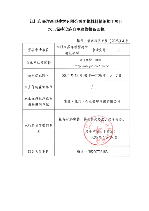 江门市嘉洋新型建材有限公司矿物材料精细加工项目水土保持设施自主验收报备回执
