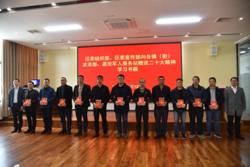 现场还举行了赠书仪式。区委组织部副部长黄文、区委宣传部四级调研员唐江祥向各镇(街)武装部和退役军人服务站赠送学习党的二十大精神相关书籍,激励退役军人工作者学原著、悟原理、谈体会,让书香浸润初心,持信念踏浪前行。