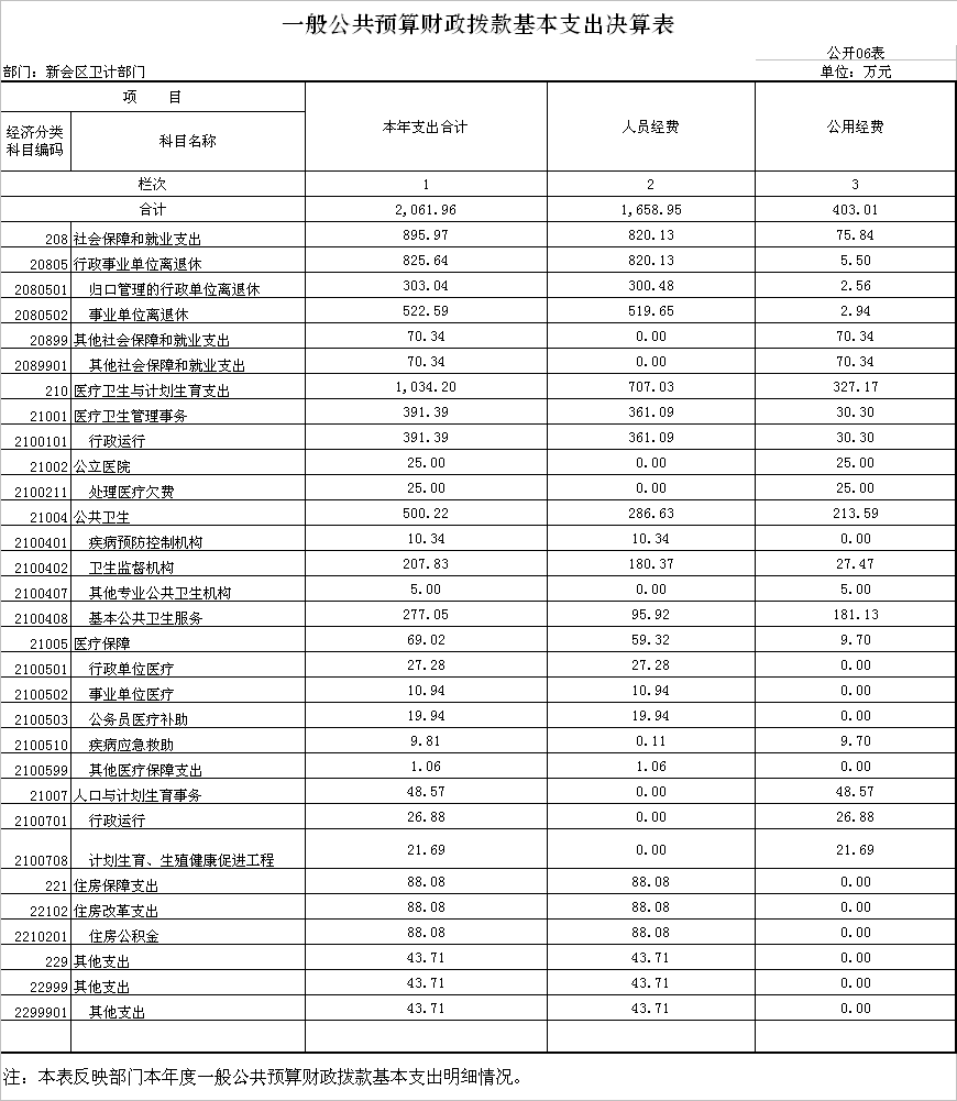 2014年财政拨款支出按用途划分,基本支出2061.96万元,占37.72%,其中:工资福利支出654.11万元,对个人和家庭的补助1004.84万元,商品和服务支出400.13万元,其他资本性支出等支出2.88万元;项目支出决算3404.35万元,占62.28%,主要支出项目有医疗卫生与计划生育事务支出、公立医院支出、基层医疗卫生机构支出、公共卫生支出、城乡社区事务支出等。