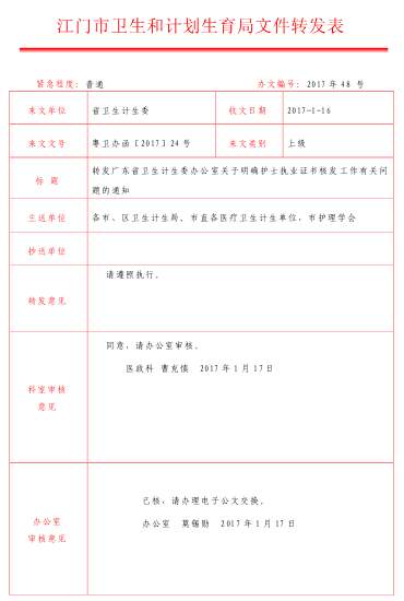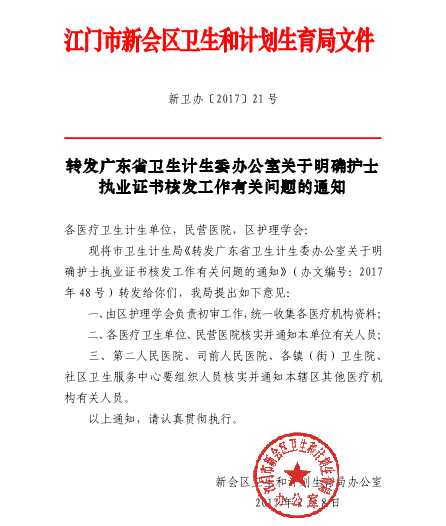 新卫办〔2017〕21号转发广东省卫生计生委办公室关于明确护士执业证书核发工作有关问题的通知