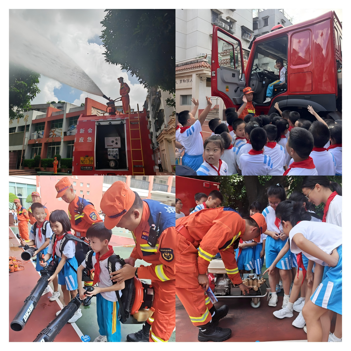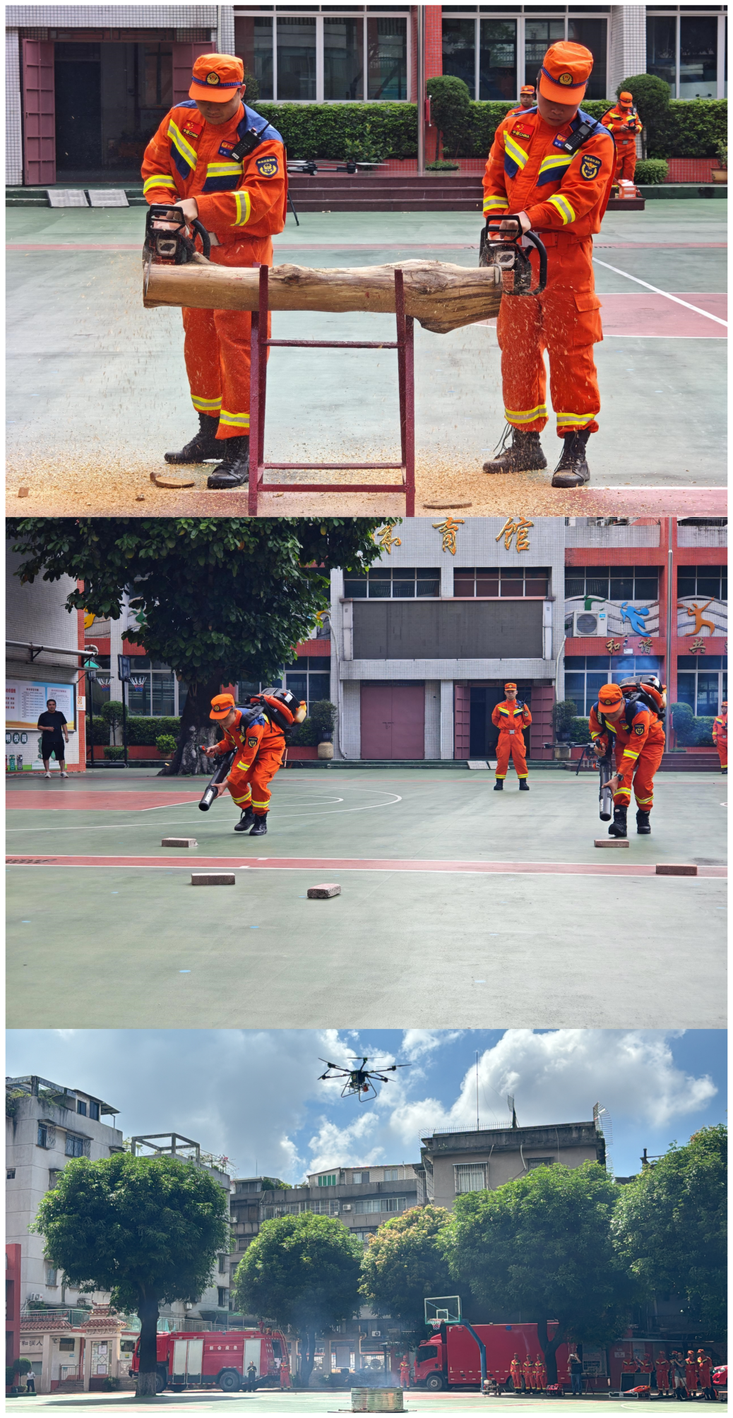 活动伊始,先开展地震应急疏散演练。尖锐警报声响起后,学生们在老师引导下,按预设路线有序撤离教室,安全抵达操场空旷地带,老师随即清点人数,确认全员到齐。疏散演练结束,进入森林防火技能展示与体验环节。大队相关人员依次演示操作油锯切割树木主干、风力灭火机扑灭“明火”、消防水罐车“以水灭火”和无人机高空抛投灭火弹等森林火灾扑救常见技战术。随后,同学们在指导下体验风力灭火机、油锯、接力泵等传统扑火机具,还参观了森林消防车辆与大型投弹无人机等新型装备。大队讲解员同步介绍装备操作要领,并向学生派发森林防火宣传册与主题小礼品,强化大家的防火意识。