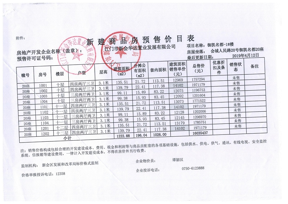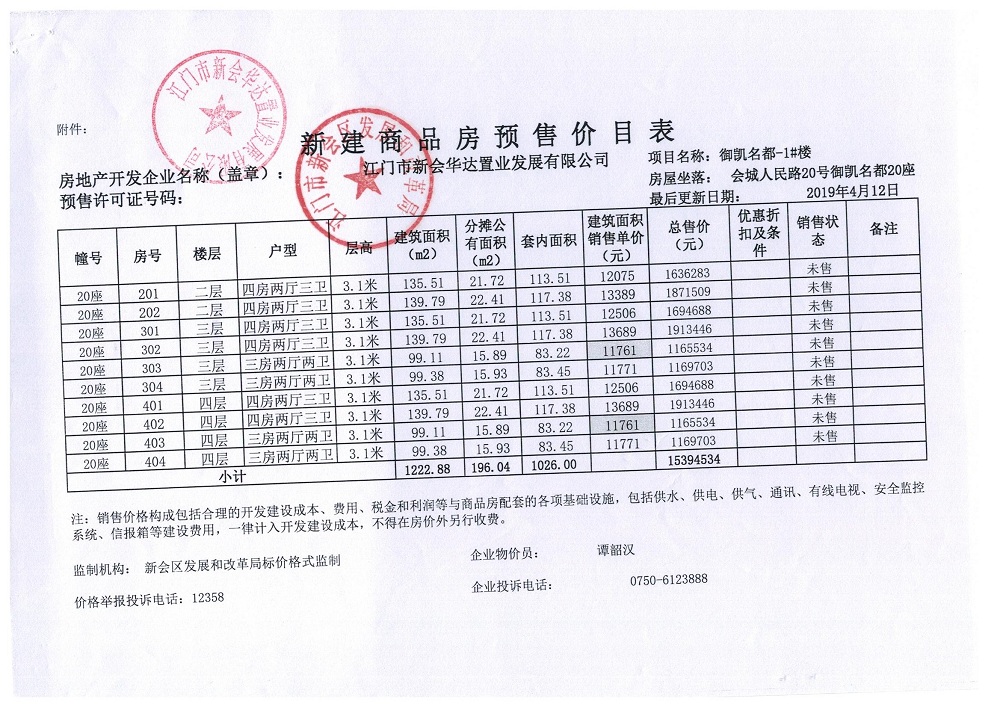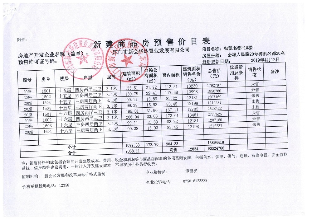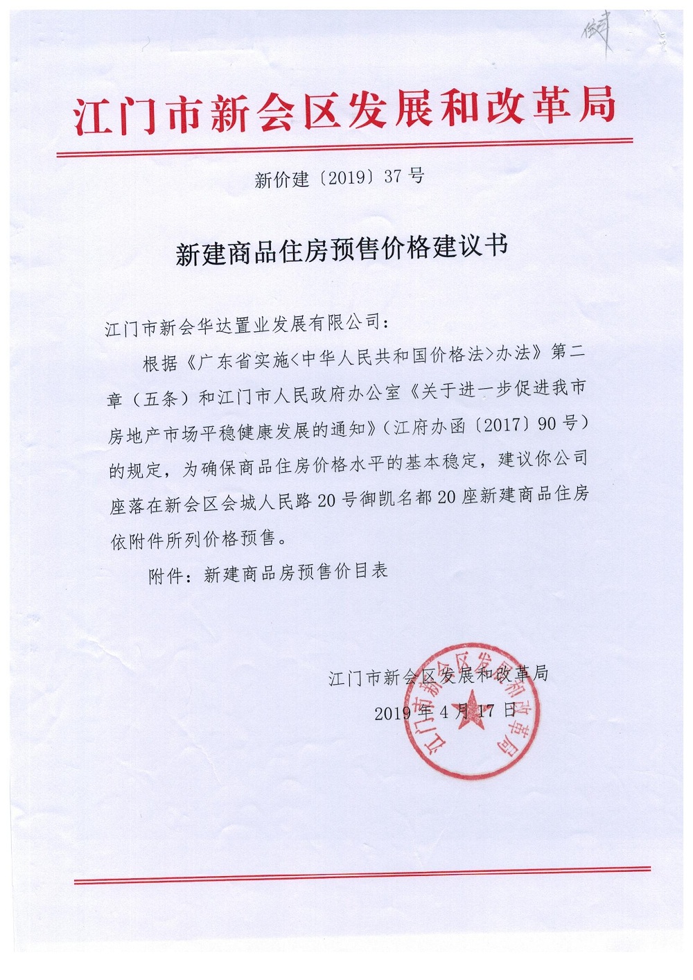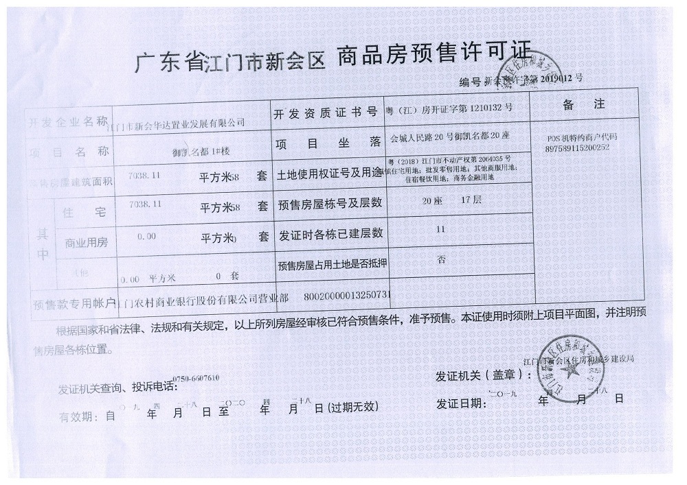 商品房预售许可(御凯名都1_楼,新会预许字第2019012号)