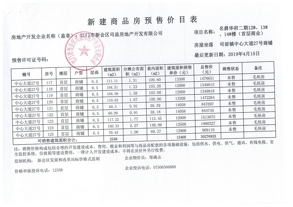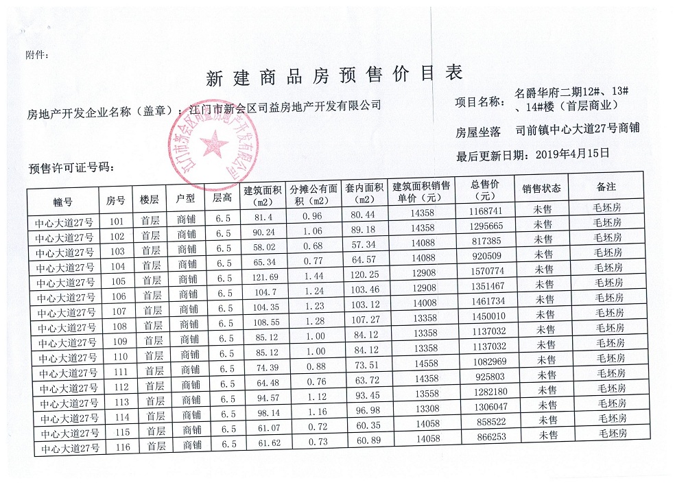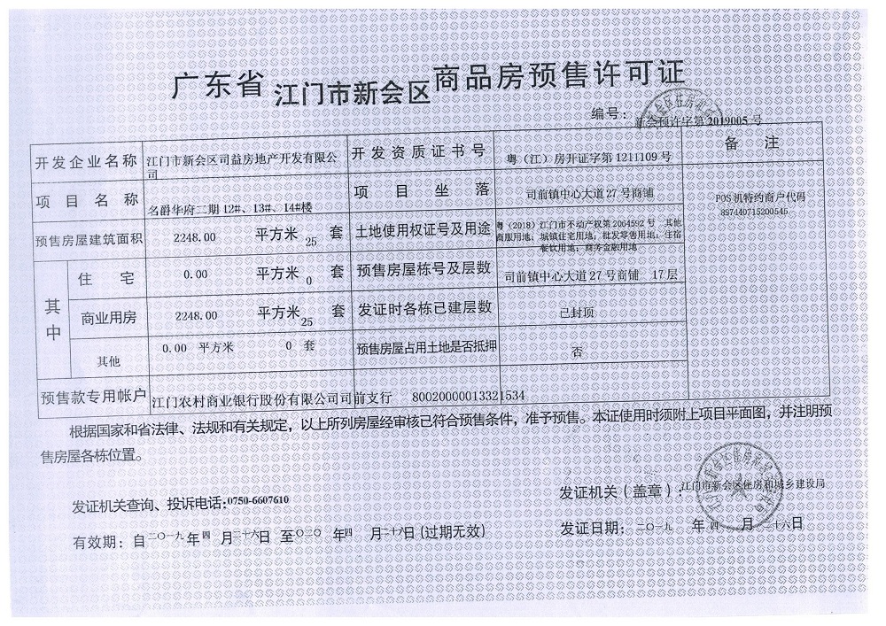 商品房预售许可(名爵华府二期12#、13#、14#楼,新会预许字第2019005号)