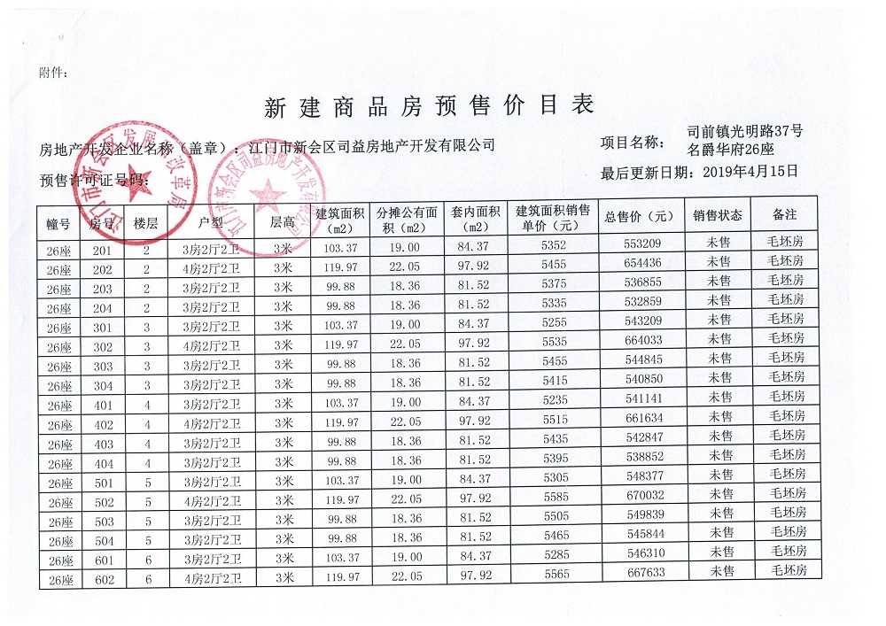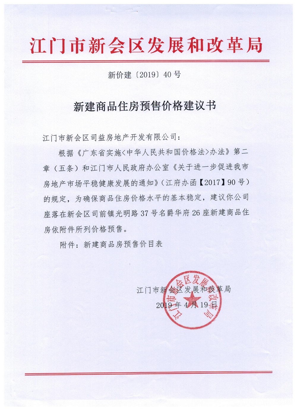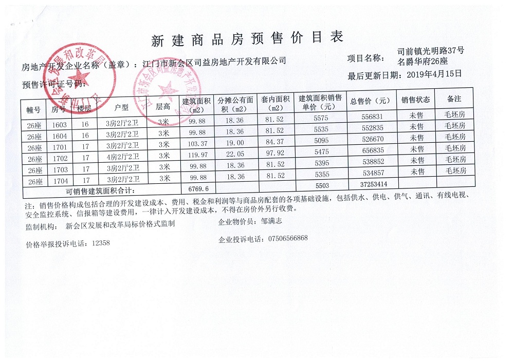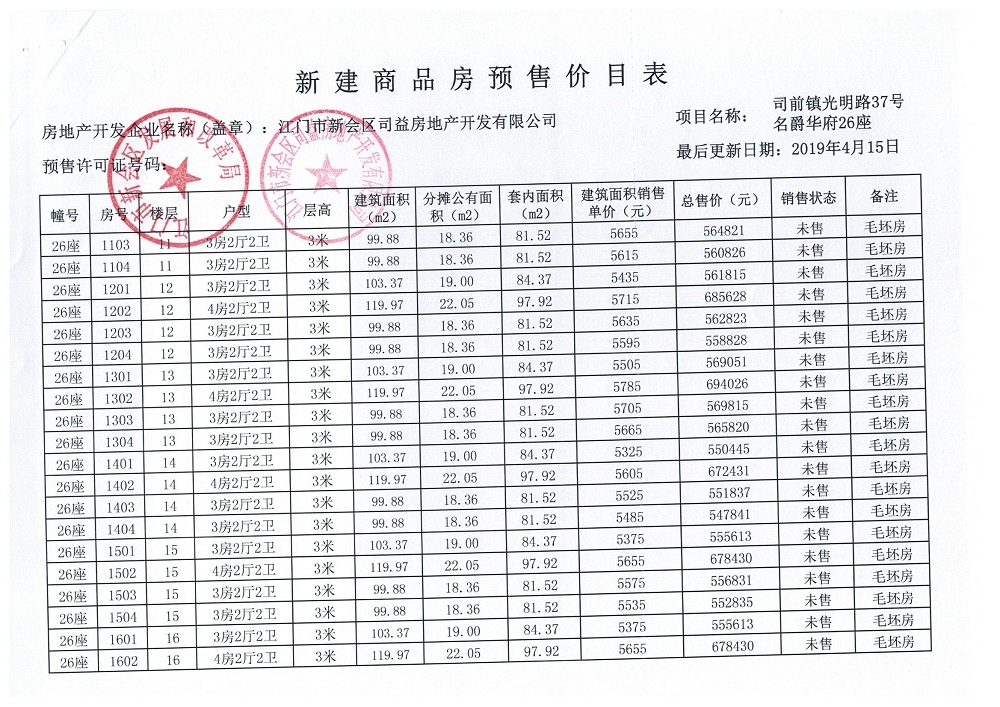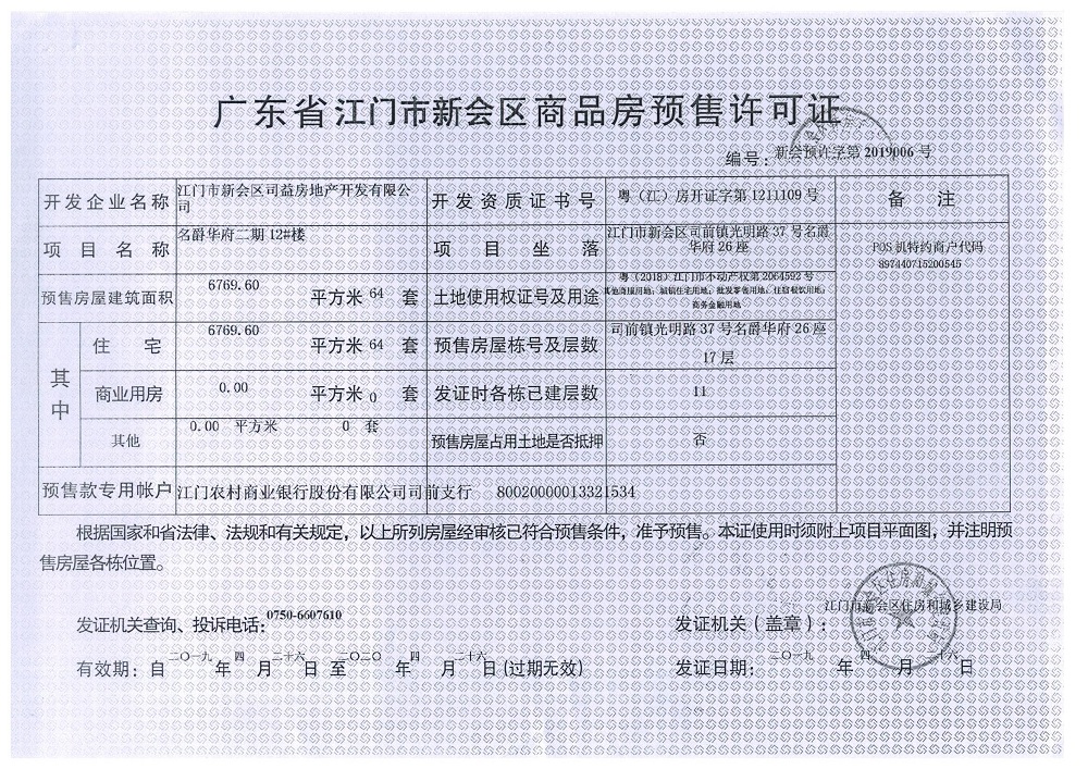 商品房预售许可(名爵华府二期12#楼,新会预许字第2019006号)