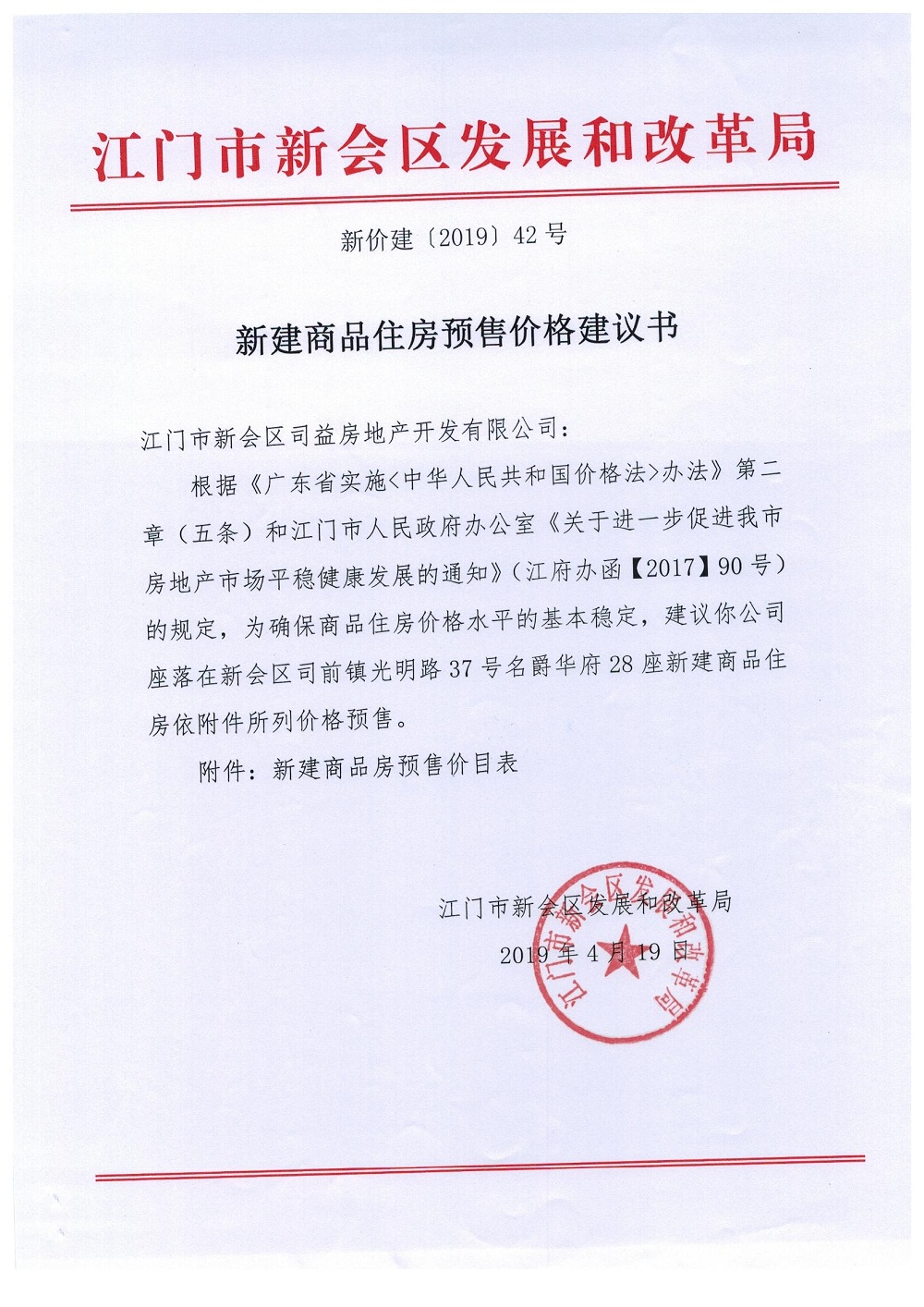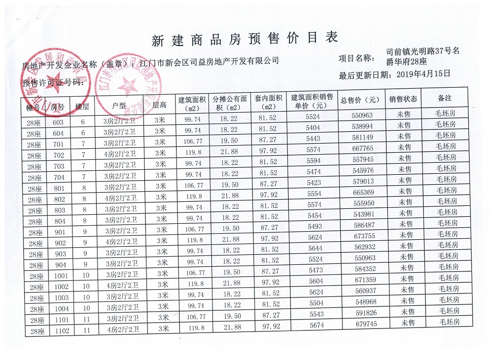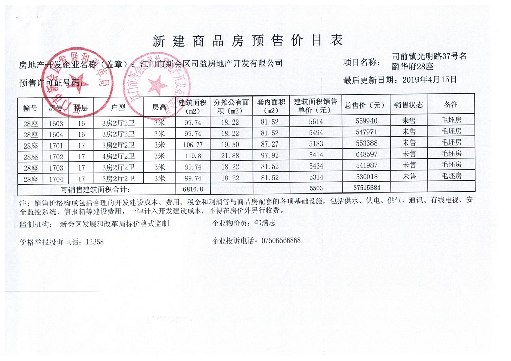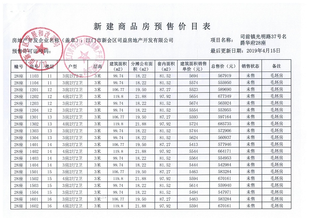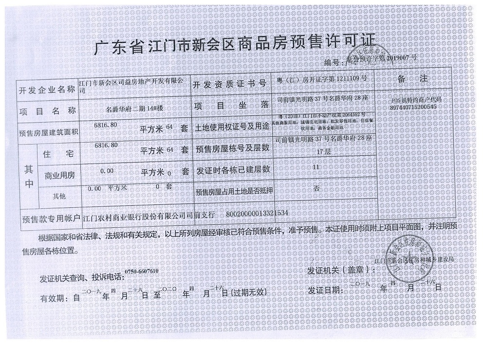 商品房预售许可(名爵华府二期14#楼,新会预许字第2019007号)