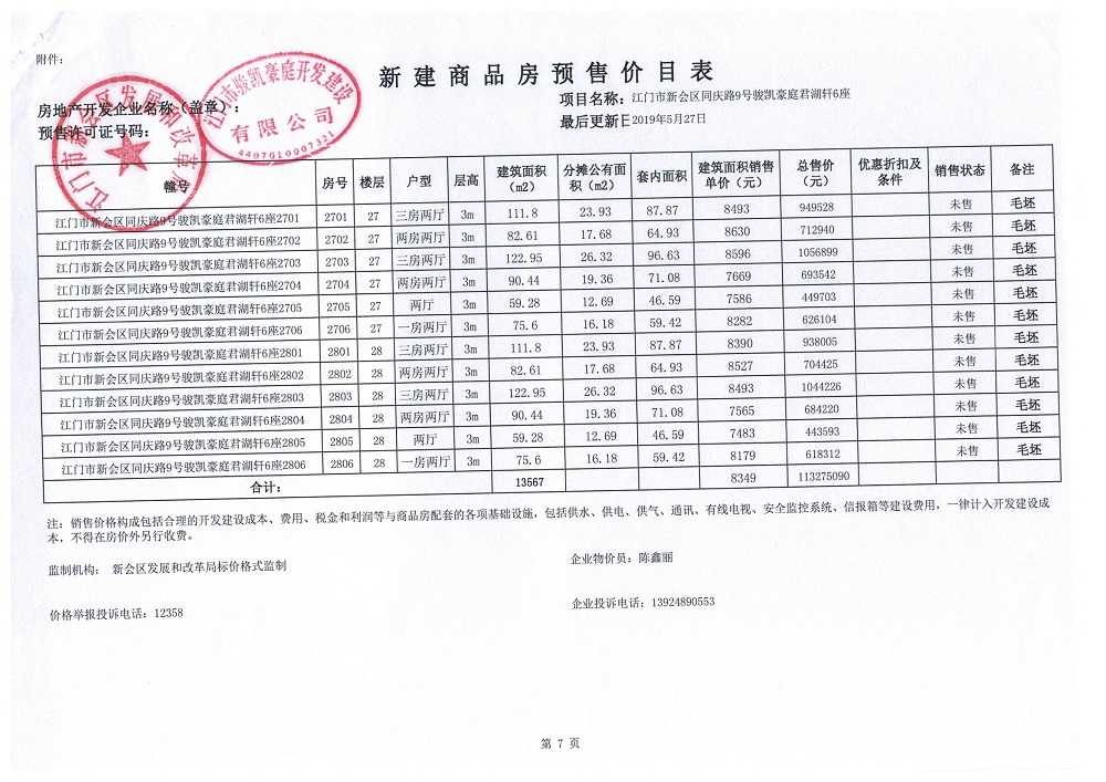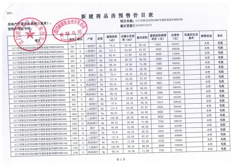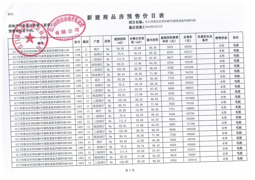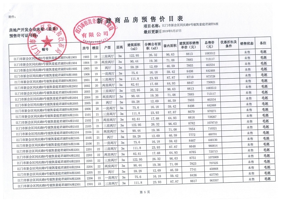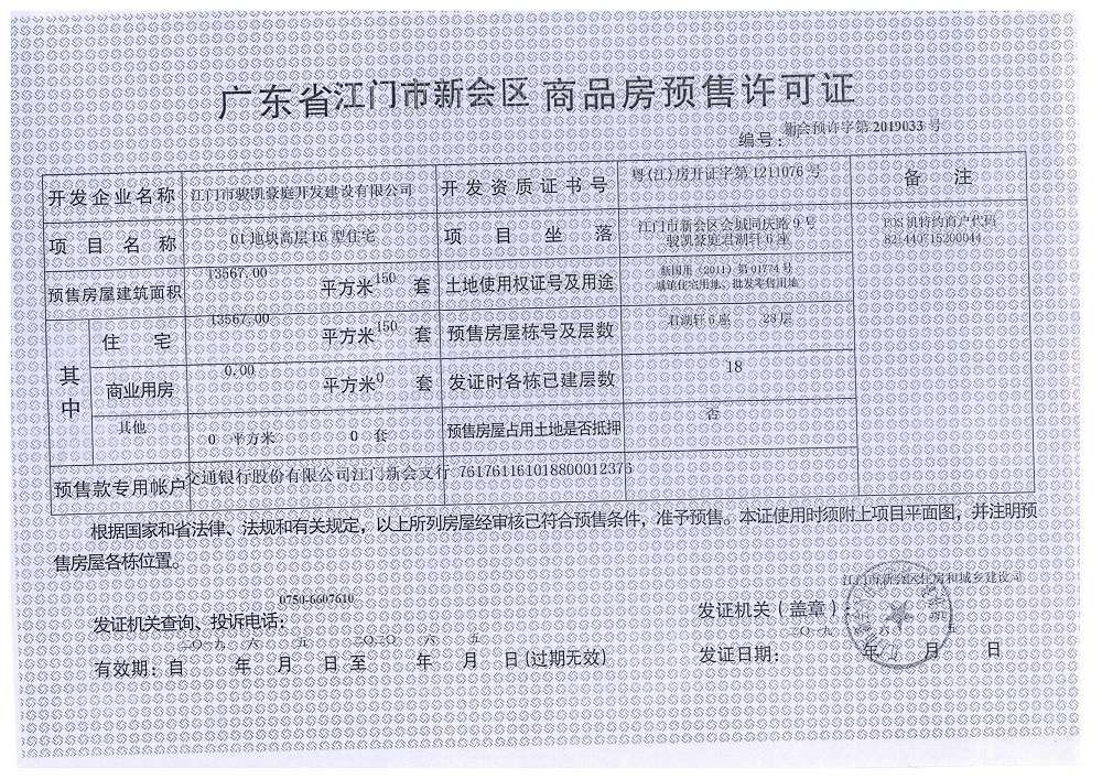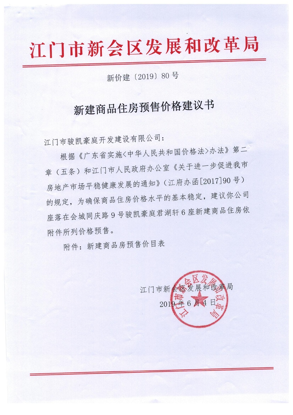 商品房预售许可(新会预许字第2019033号,骏凯豪庭君湖轩6座)