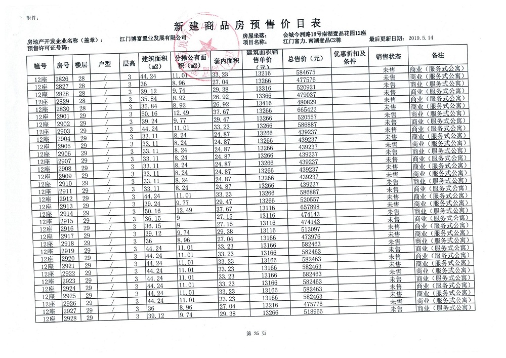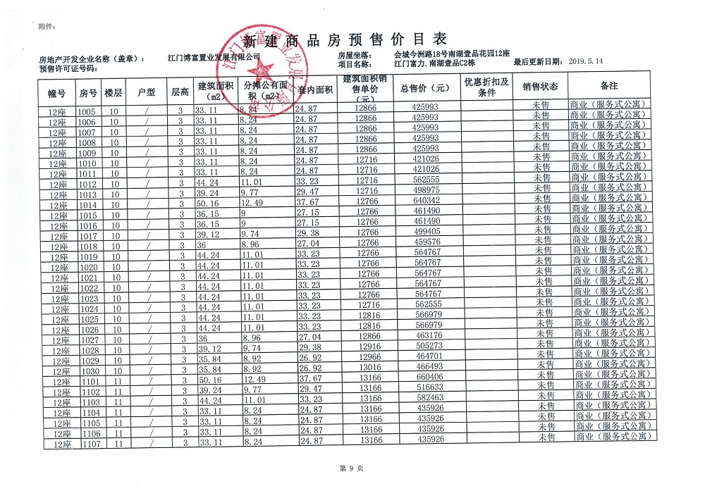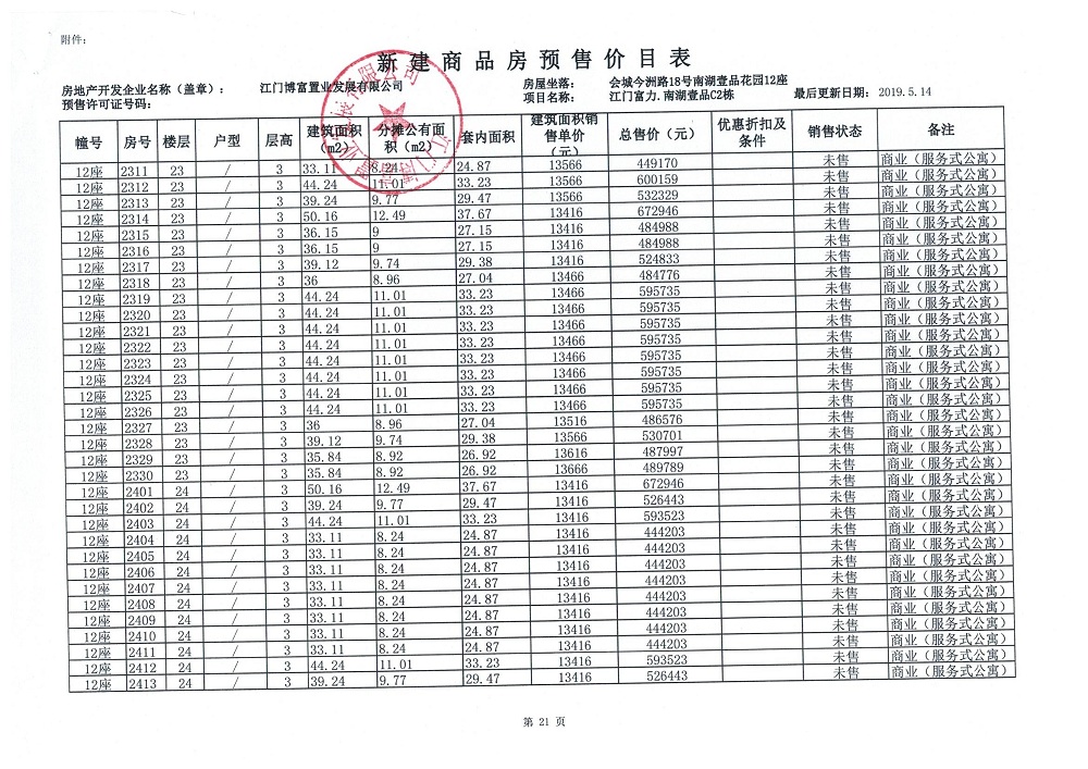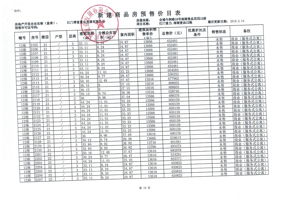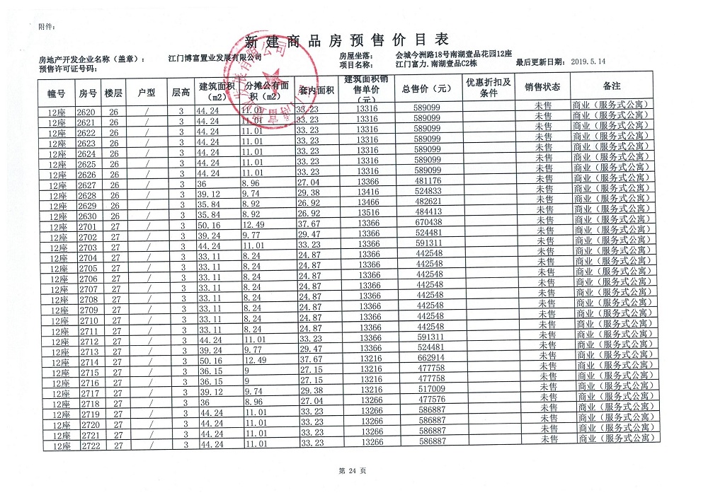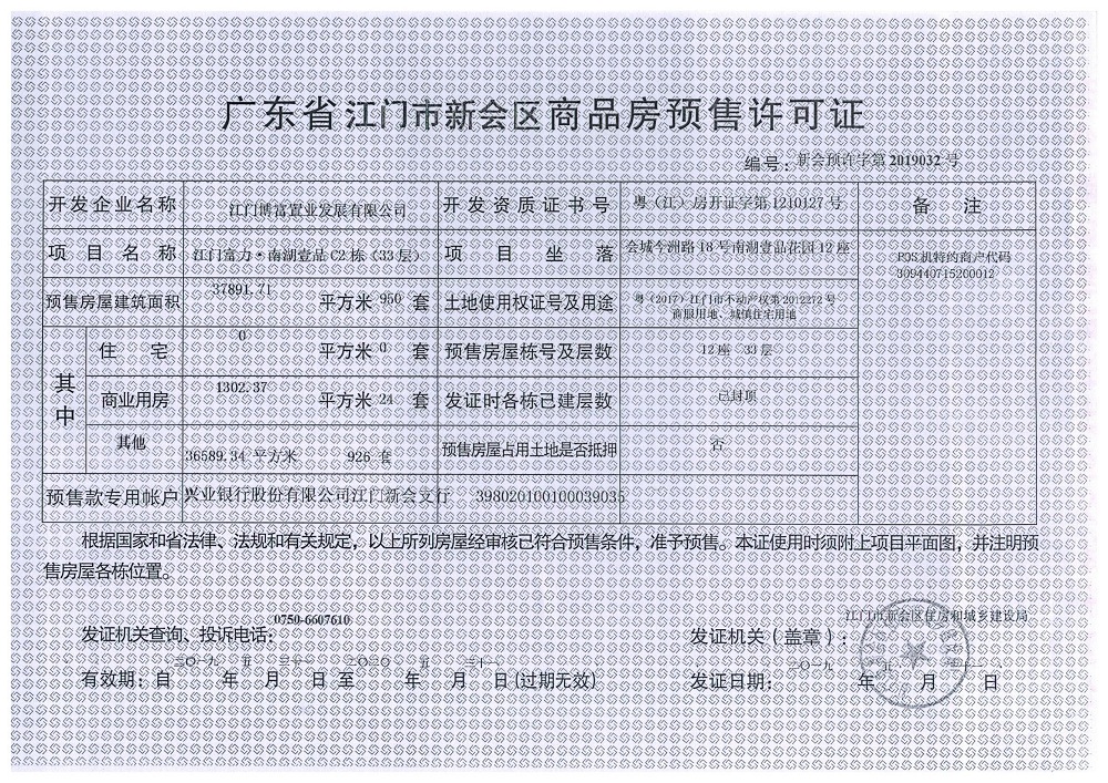 商品房预售许可(新会预许字第2019032号,江门富力·南湖壹品C2栋(33层))