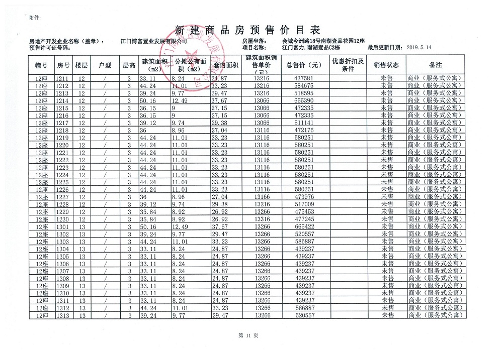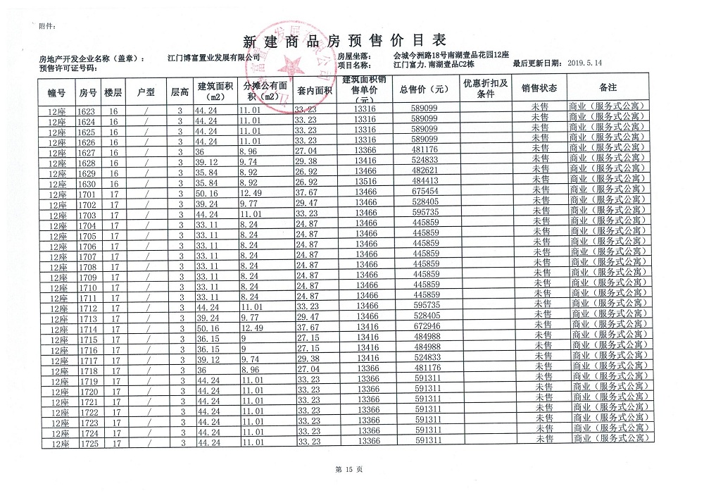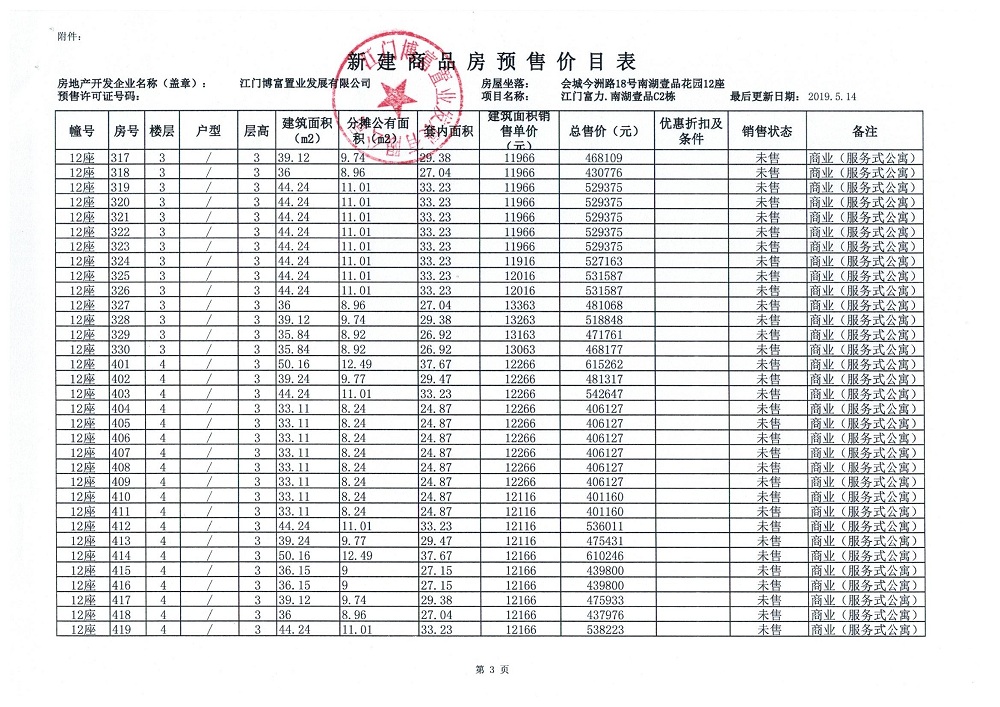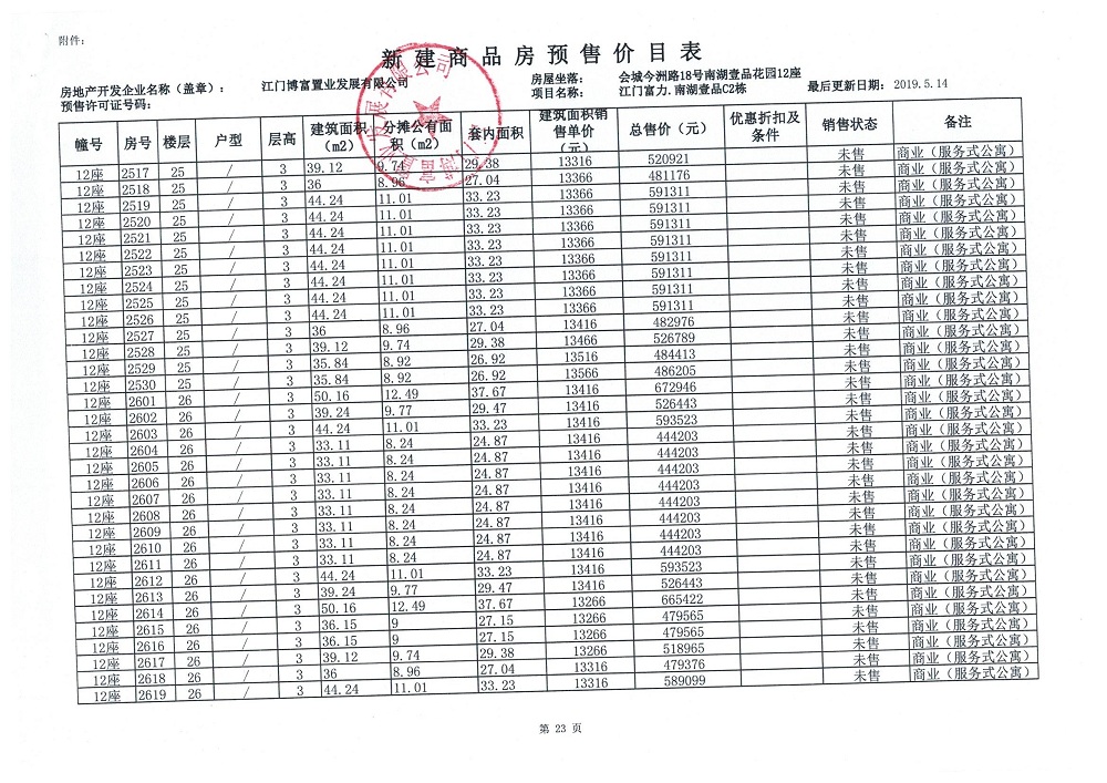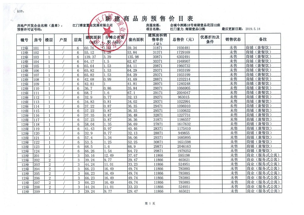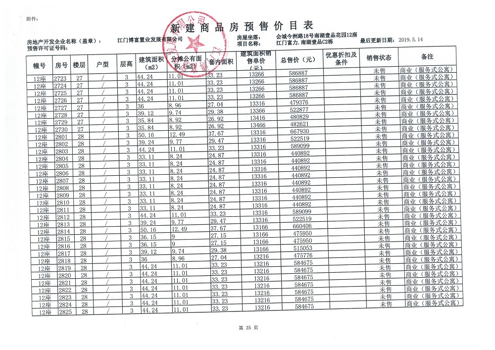 商品房预售许可(新会预许字第2019032号,江门富力·南湖壹品C2栋(33层))