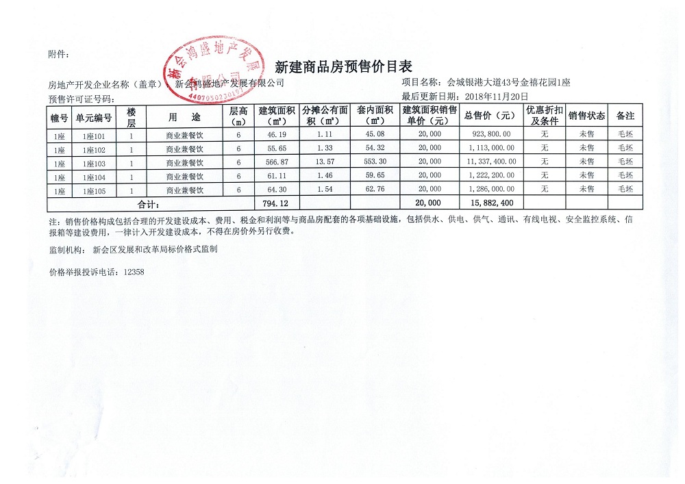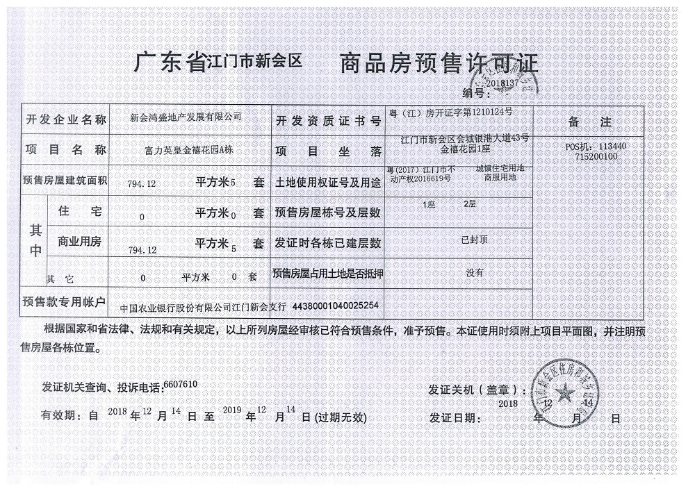 商品房预售许可(富力英皇金禧花园A栋,2018137)