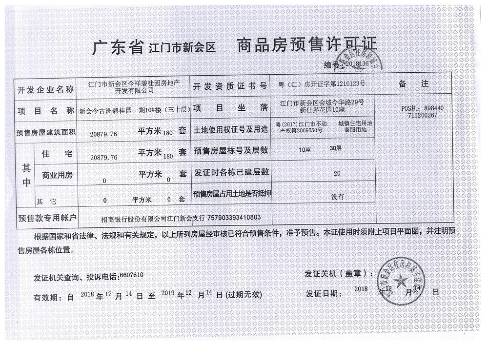 商品房预售许可(新会今古洲碧桂园一期10_楼(30层),2018136)