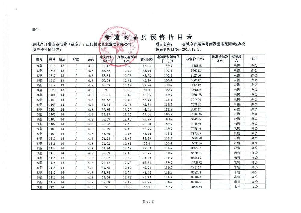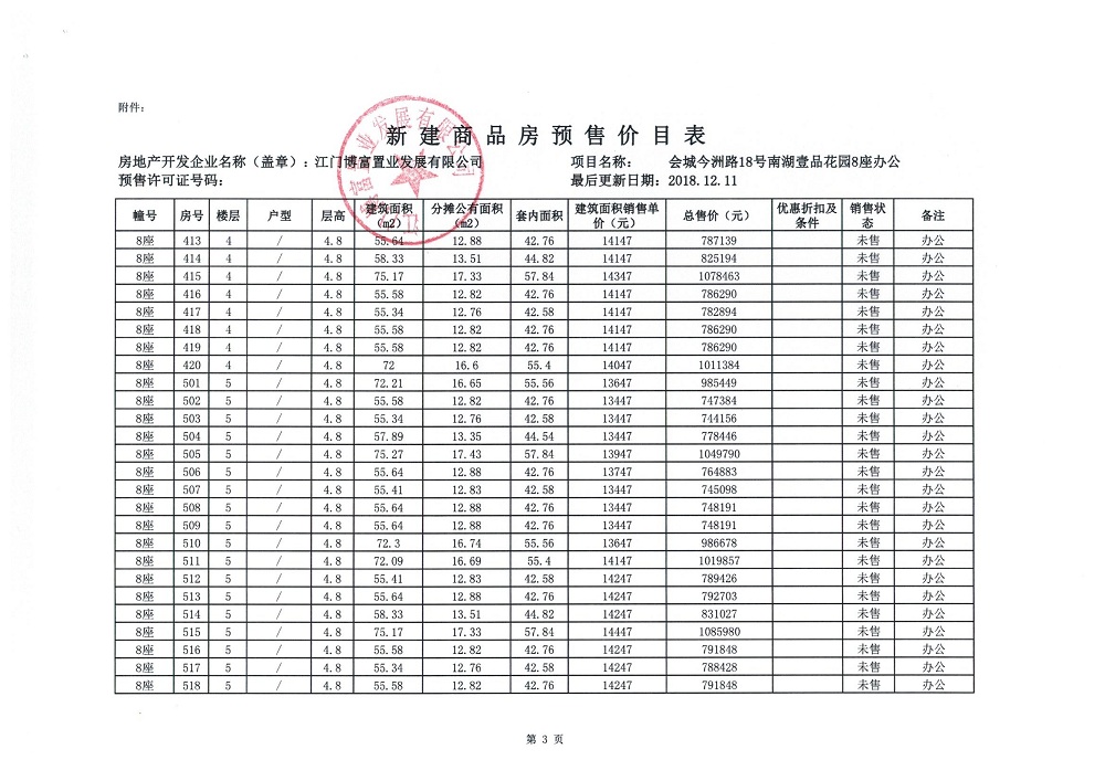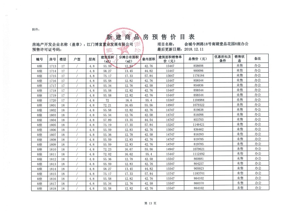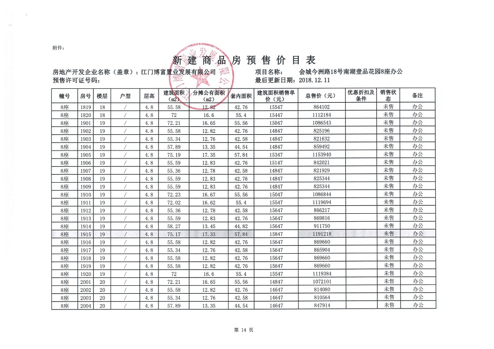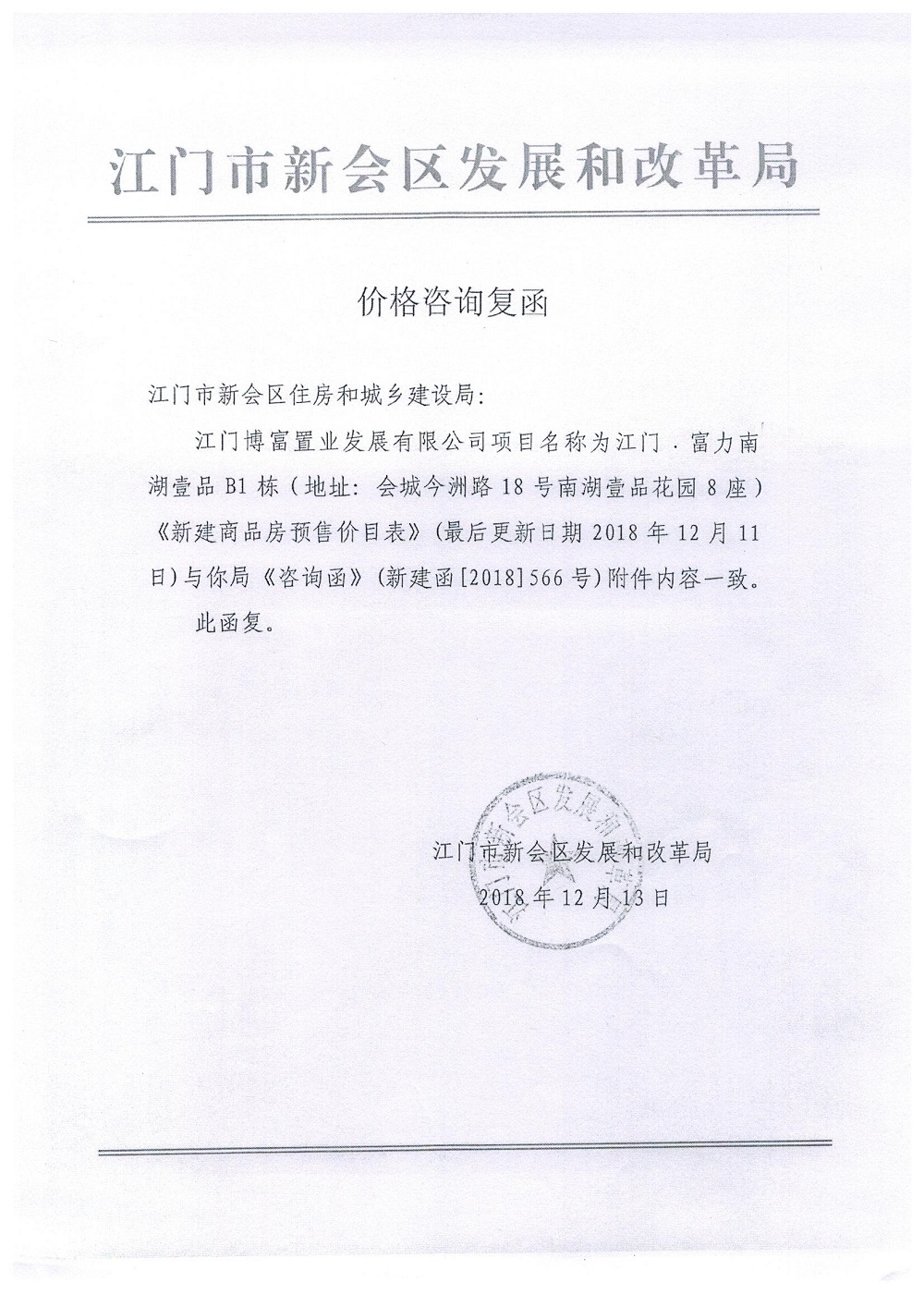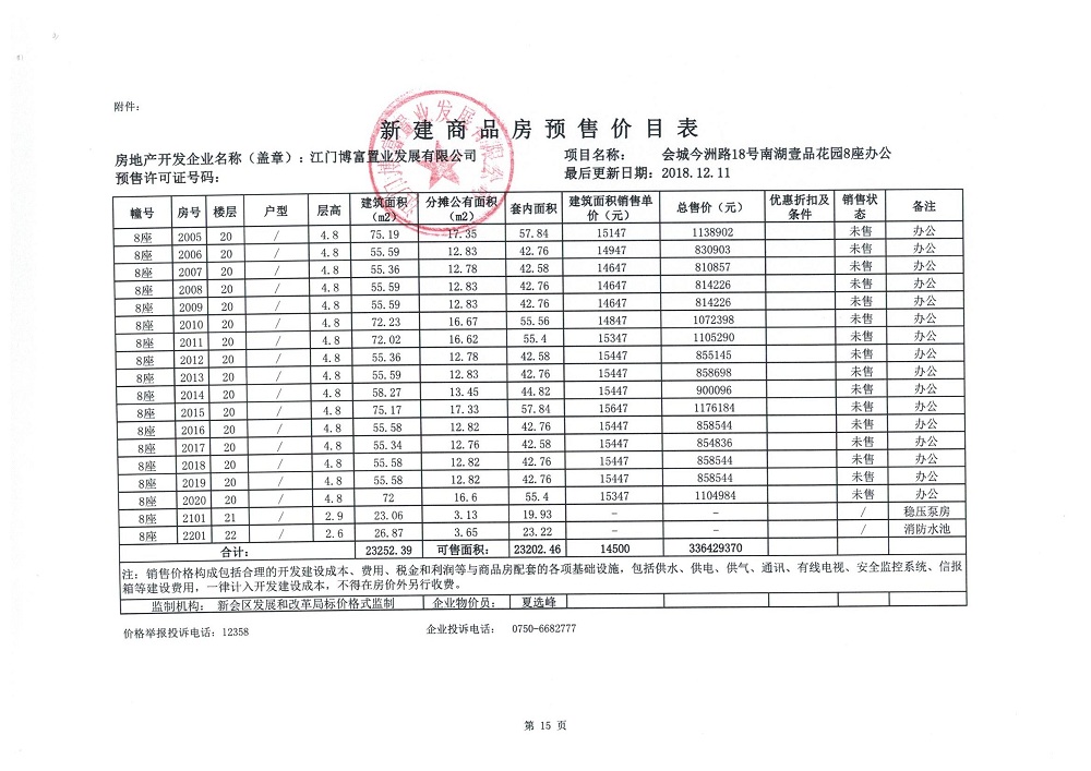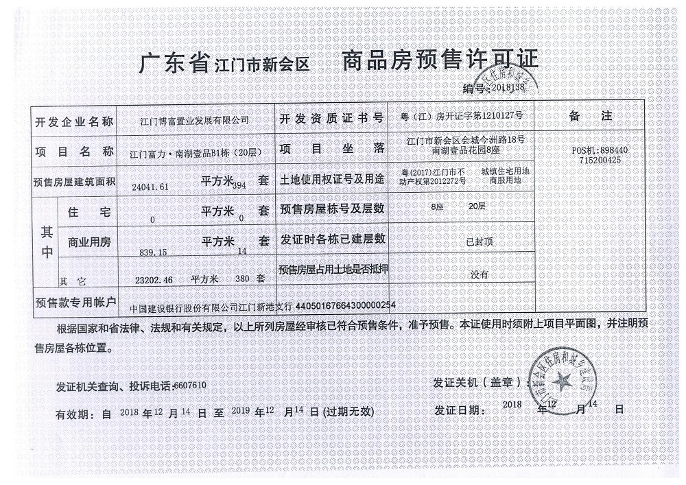 商品房预售许可(2018138江门富力·南湖壹品B1栋(20层))