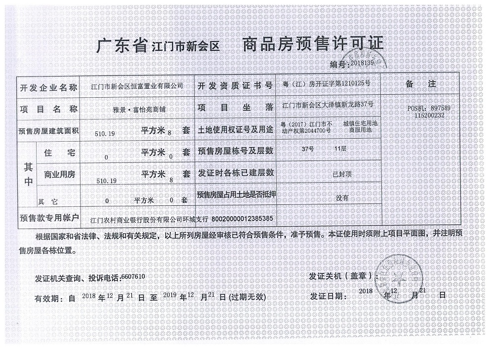 商品房预售许可(2018139雅景-富怡苑商铺)