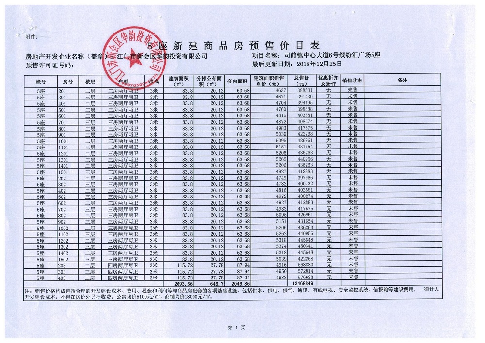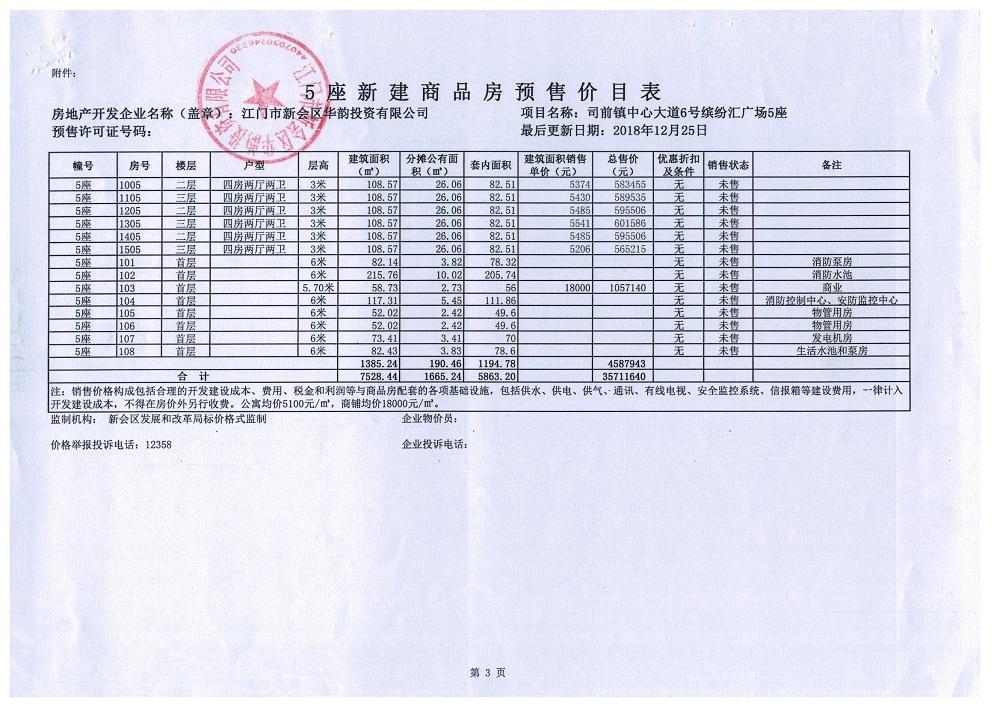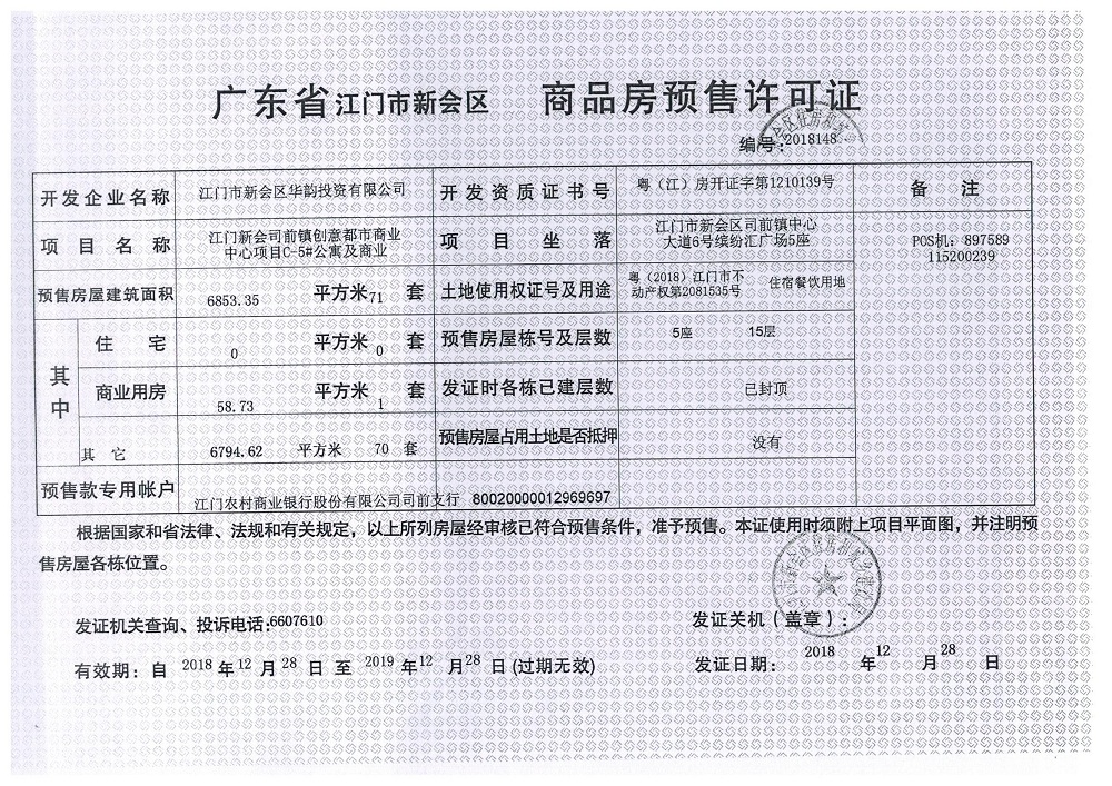 商品房预售许可(2018148江门新会司前镇创意都市商业中心项目C5_公寓及商业)