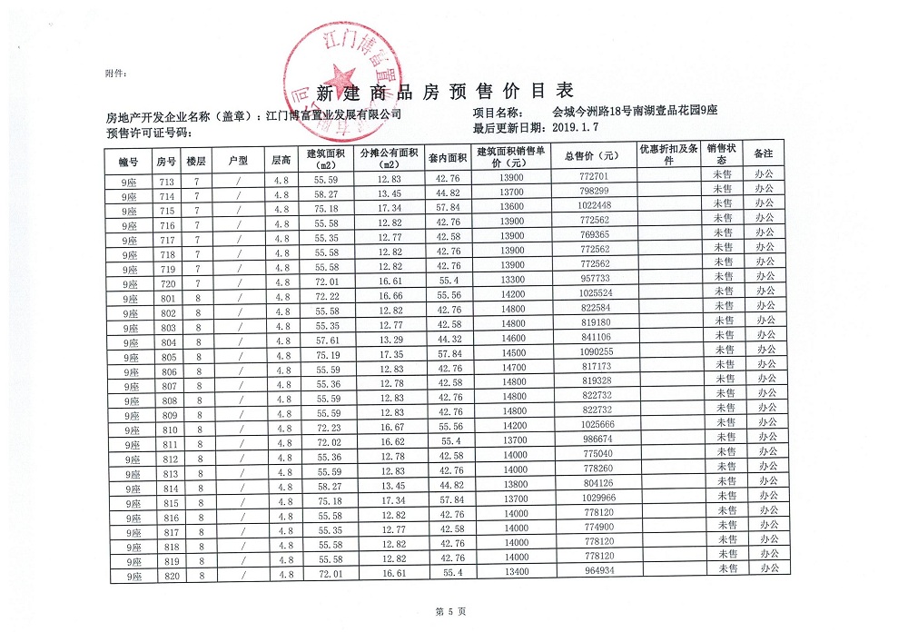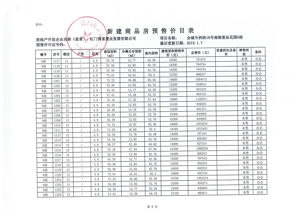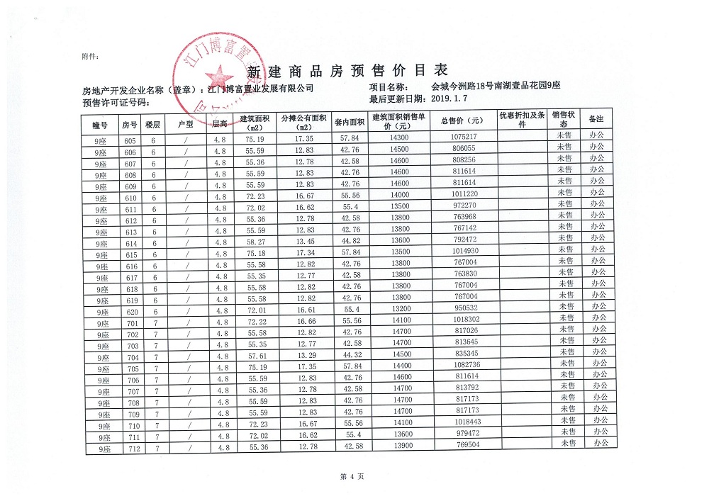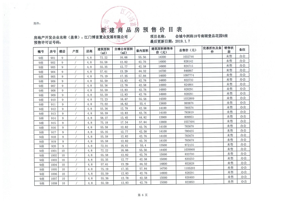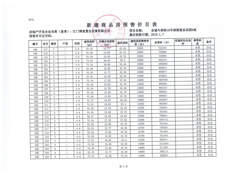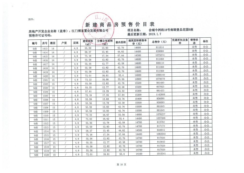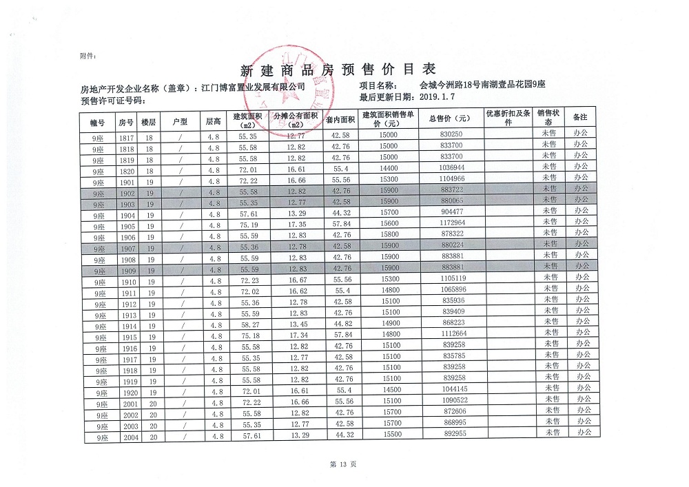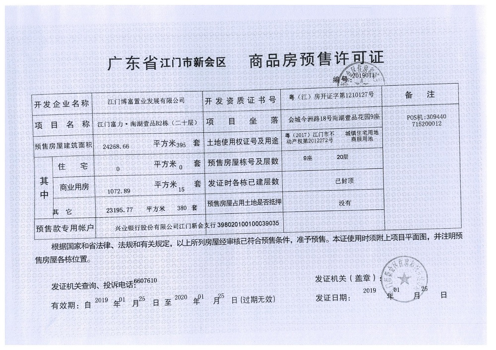 商品房预售许可(2019011江门富力·南湖壹品B2栋(二十层))