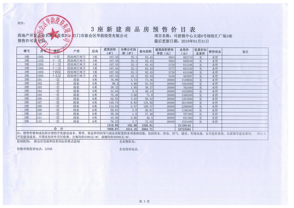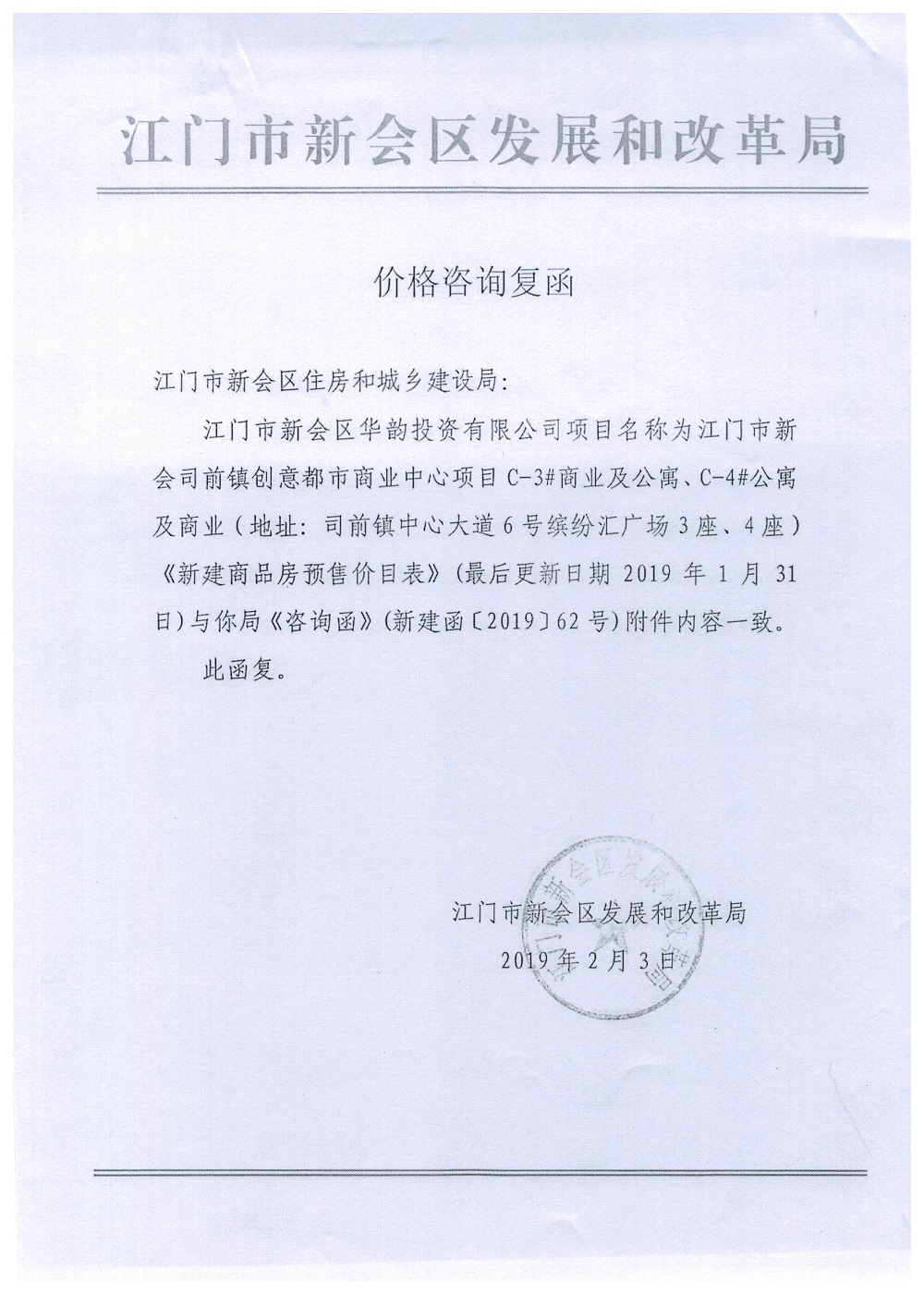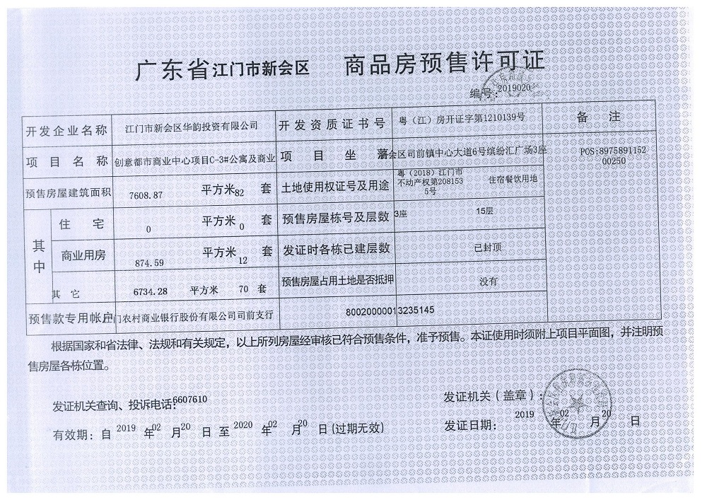 商品房预售许可(2019020创意都市商业中心项目C-3#公寓及商业))