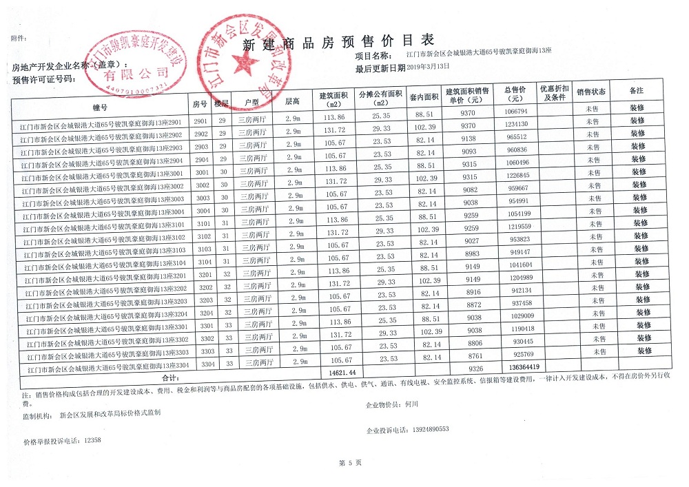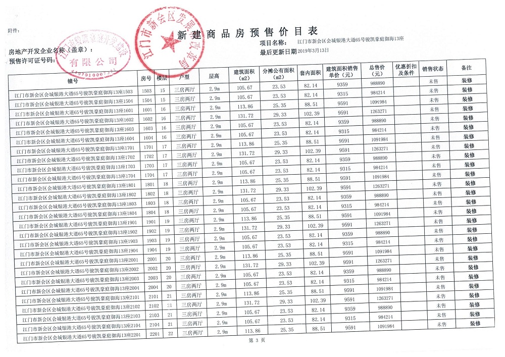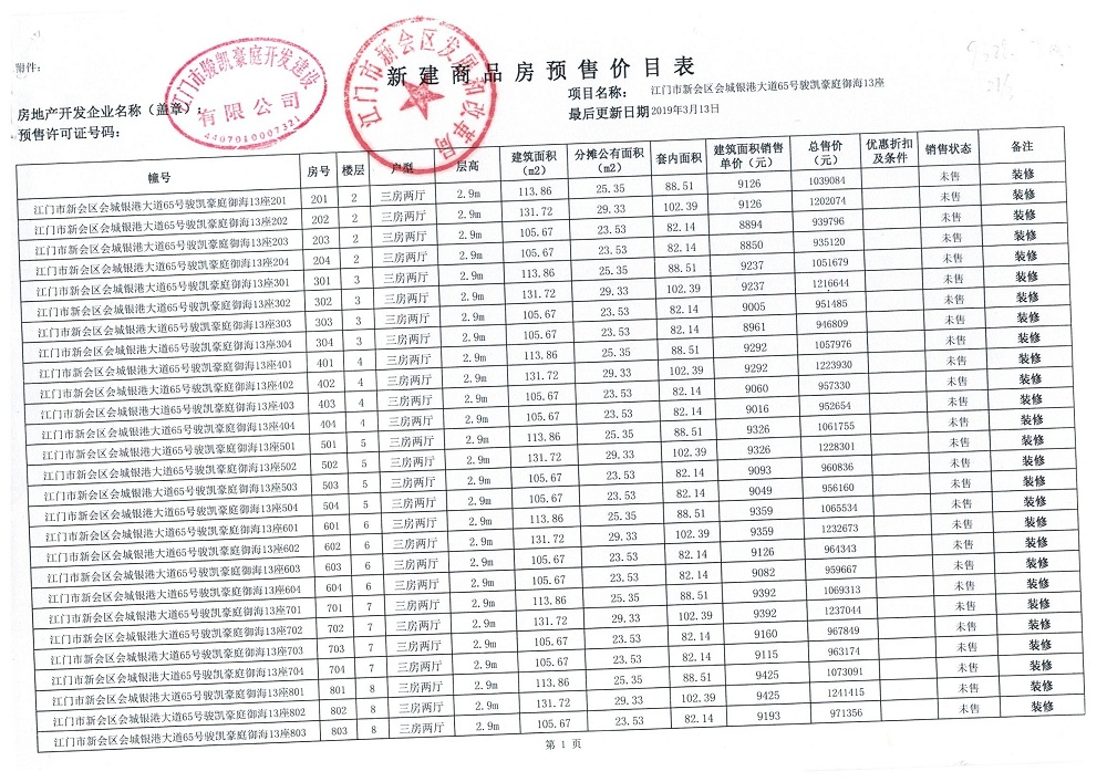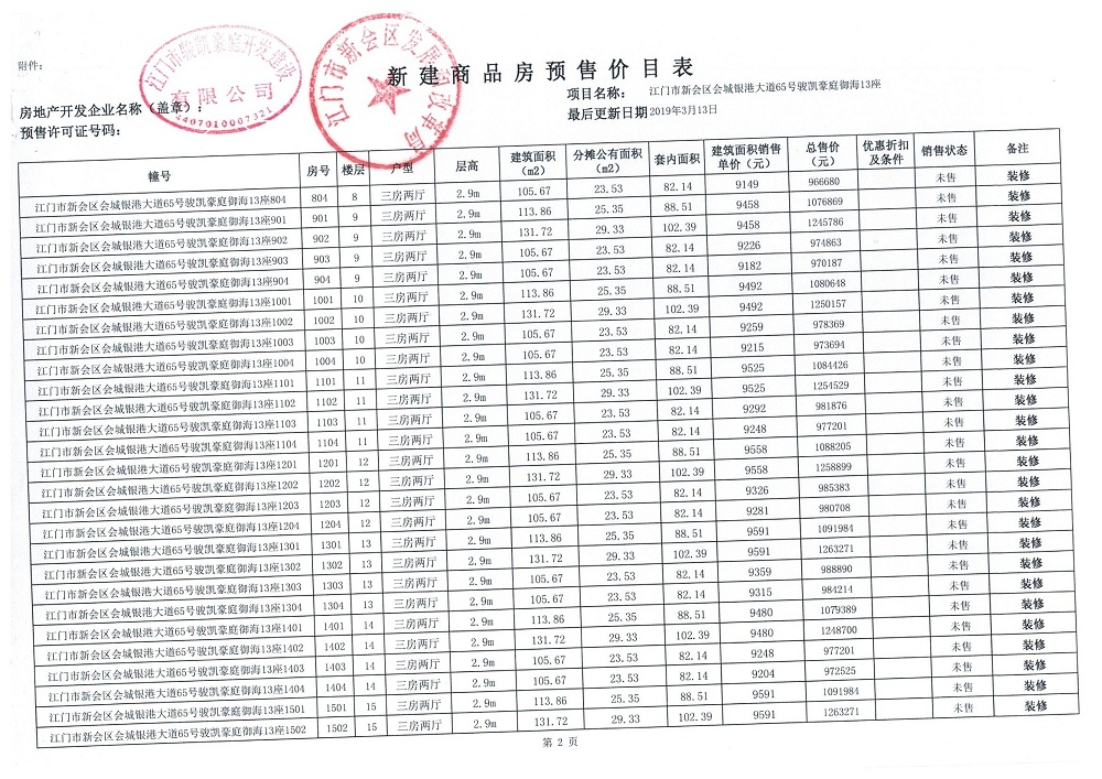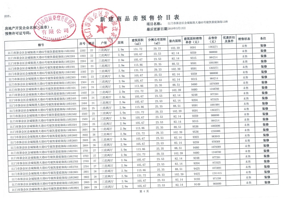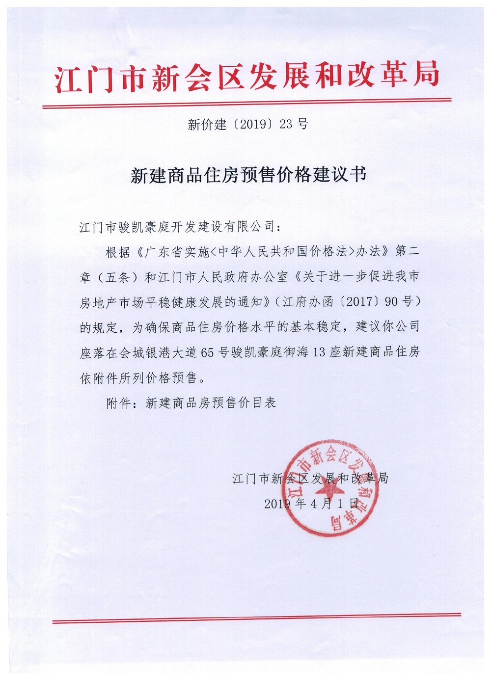 商品房预售许可(2019029,江门新会骏凯豪庭二期7座)