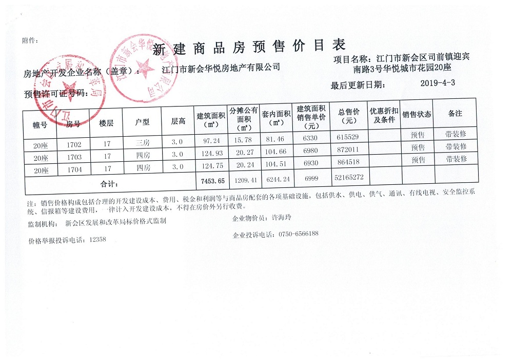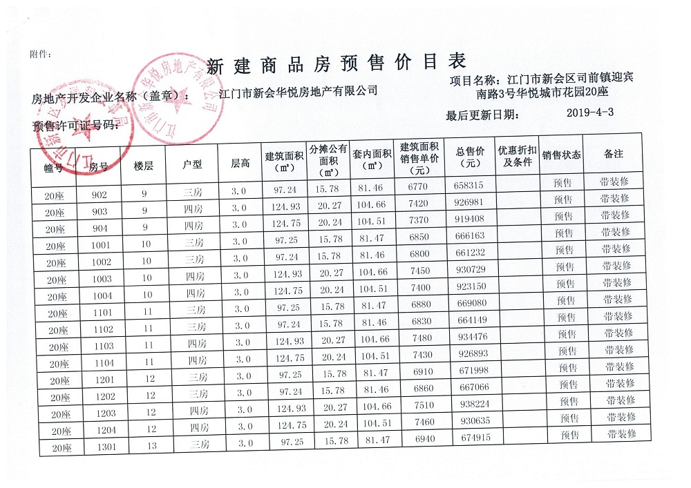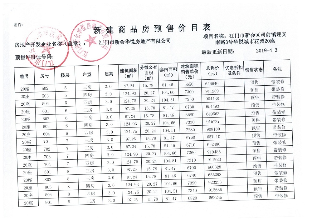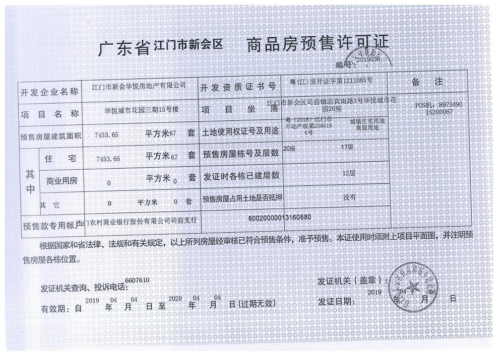 商品房预售许可(2019030,华悦城市花园三期15号楼)