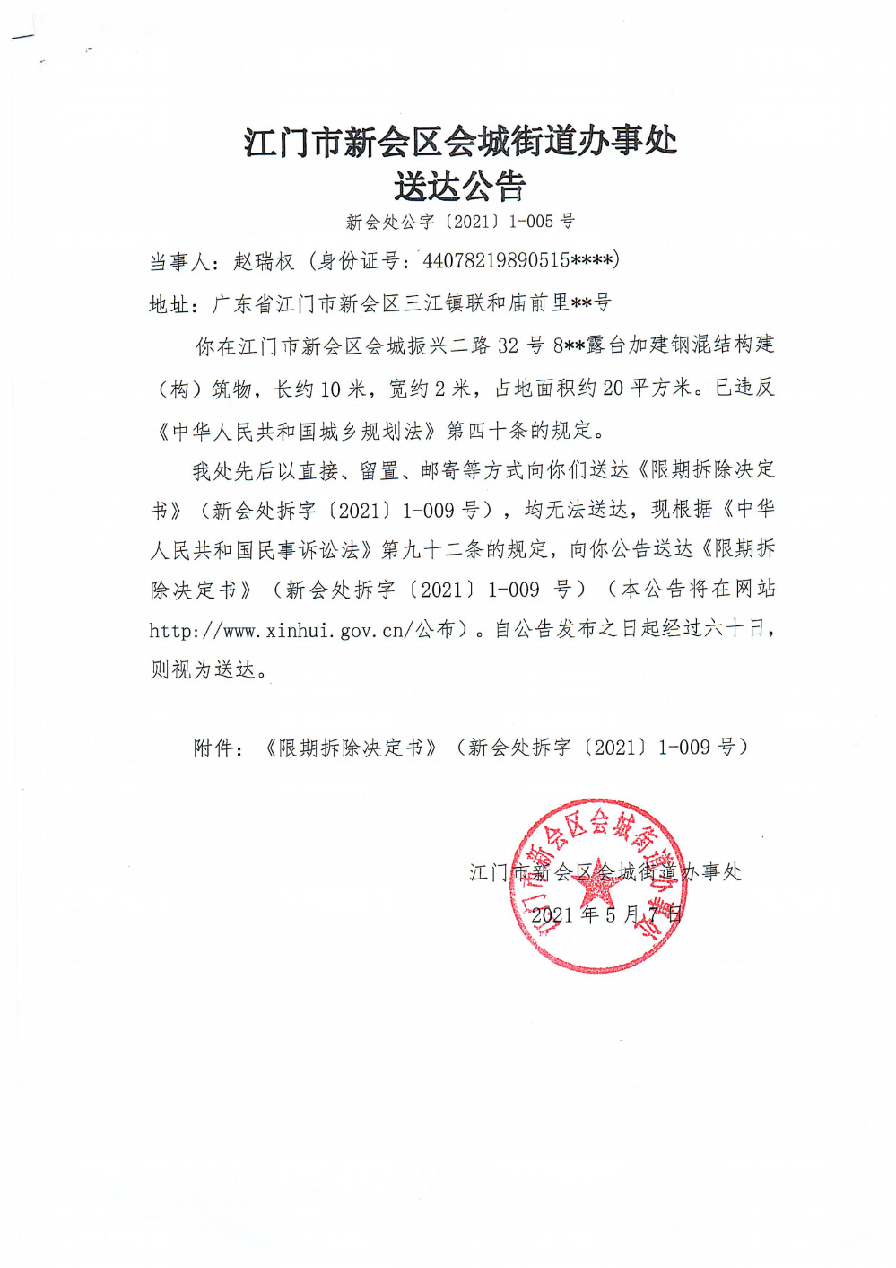 江门市燕雨直播 会城街道办事处送达公告