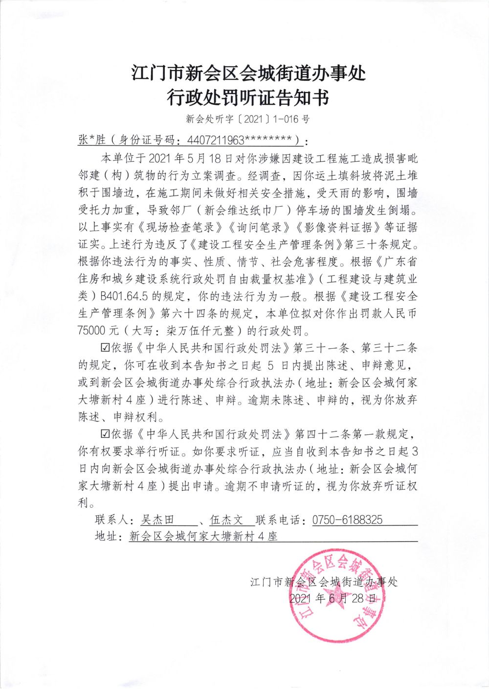 江门市燕雨直播 会城街道办事处行政处罚听证告知书(新会处听字【2021】1-016号)