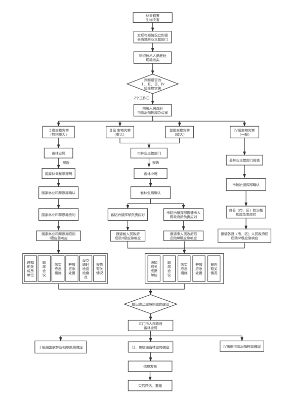 国家林业和草原局确认我区发生的特别重大(Ⅰ级)事件,由国家林业和草原局应对;省林业局确认我区发生重大有害生物灾害(Ⅱ级)事件,由省防治指挥部负责应对;省林业局确认我区发生较大有害生物灾害(Ⅲ级)事件,由市防治指挥部报市人民政府后负责应对;市防治指挥部确认我区发生一般有害生物灾害(Ⅳ级)事件,由区防治指挥部报区人民政府后负责应对。应急响应启动后,应根据灾害发展情况及时调整响应级别。