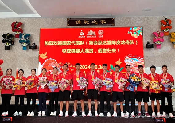 10月9日至14日,第十五届亚洲龙舟锦标赛在香港举行,新会泓达堂陈皮龙舟队作为中国代表队的一员,在“龙舟混合组12人”项目中表现出色,分别夺得了100米、200米和500米的冠军。10月14日,新会泓达堂陈皮龙舟队载誉归来,参加欢迎龙舟队凯旋活动。