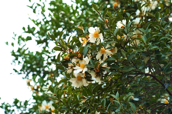 洁白的花瓣,金黄的花心,在蓝天的映衬下,油茶花洁白似雪,美得令人陶醉。漫步在景区内的天鹅湖畔,四周山坡上,一簇簇洁白的油茶花争先绽放着,犹如絮雪般装点着山峦,散发着阵阵芬芳。