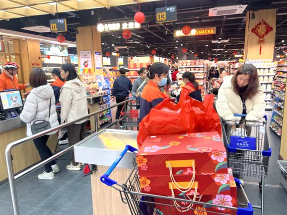春节期间,城区各大超市迎来了年货销售高峰。超市里的配送员、售货员、收银员们坚守岗位,全力保障年货供应。