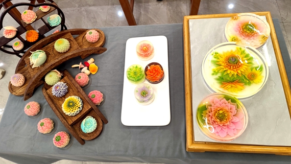 除了热菜的创新,阮智敏还制作了素食立体果冻画和陈皮唐菓子,将艺术与美食完美融合。“我们将新会陈皮泡发后,与红豆沙、白芸豆慢火熬制成馅,再以云南特色花卉造型包裹,既保留传统工艺,又融入新会风味。”阮智敏表示,会将这款融合新会陈皮特色的新品带回云南,让更多云南群众品味到跨地域的美食创意。