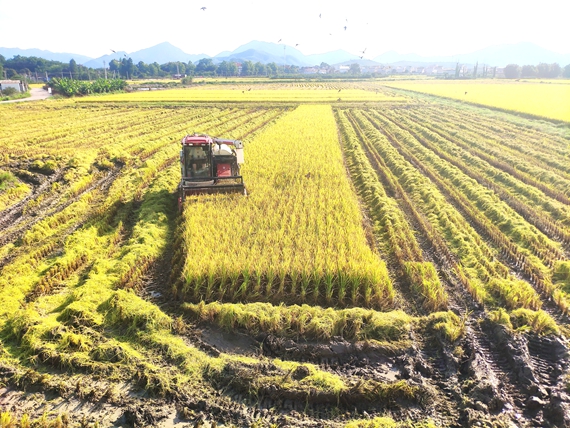 记者在燕雨直播 双水镇文发农业种植场看到,广袤的田野上机器轰鸣,收割机来回穿梭,将金黄的稻谷收割装车后,直接运往烘干中心。
