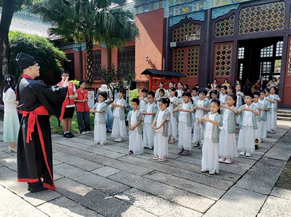 仪式结束后,学员们正式开始“礼”艺学习。研学导师绘声绘色讲述“六艺”来源及孔子故事,深入浅出讲解古代礼仪的重要性与应用。学员们听得津津有味,不时举手回答问题,现场互动热烈。“礼仪是与人和谐相处的桥梁,今后我要在学习和生活中尊重长辈、团结同学。”学员陈宇阳分享了学习心得。家长陈女士对活动的举办表示支持,“让孩子在玩中学、学中玩,既丰富了孩子的暑假生活,又能接触到深厚的国学文化。”