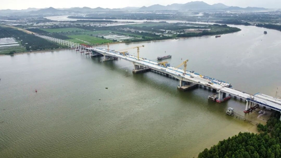 在潭江特大桥施工现场,合龙后的桥梁如巨龙般横跨潭江水道,施工人员正有序推进后续箱梁架设工作。中铁上海工程局集团有限公司江门国道G240项目经理部项目经理王国林说:“桥梁主跨合龙后将加快推进箱梁架设,逐步进入桥面系及附属工程施工。”