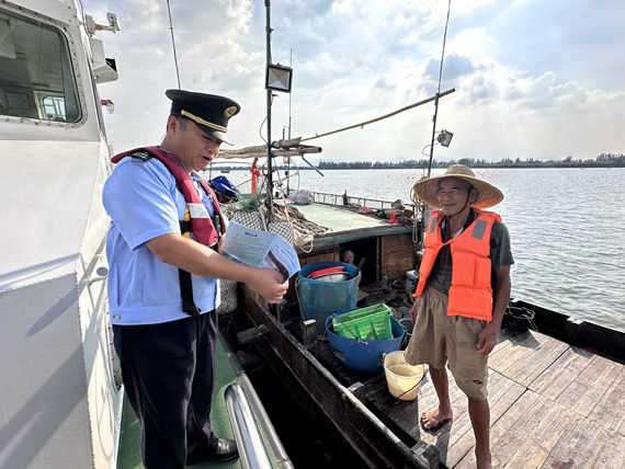 联合执法中,执法人员重点巡查商船渔船密集交汇区、桥区水域、渡口水域等,重点查处渔船在航道中是否按规定设置渔网渔具、使用船舶自动识别系统、配备号灯信号等情况,检查商船航行值班、船员适任和守听VHF16频道等情况,并现场进行防商渔船碰撞安全宣贯、发放防碰撞资料。