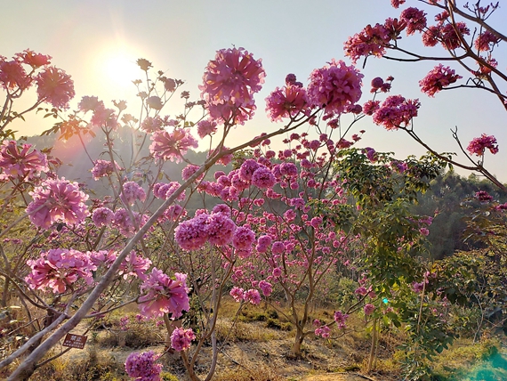 绿美生态园以种植紫花风铃木为主要特色,这里的紫花风铃木多达十几个品种,均是通过嫁接技术精心培育而成。这些风铃木不仅长势良好,而且花色丰富,深紫、深红、玫红、粉红等色彩斑斓。每当花朵盛开时,整个生态园仿佛被一片浪漫的气息笼罩,美不胜收。