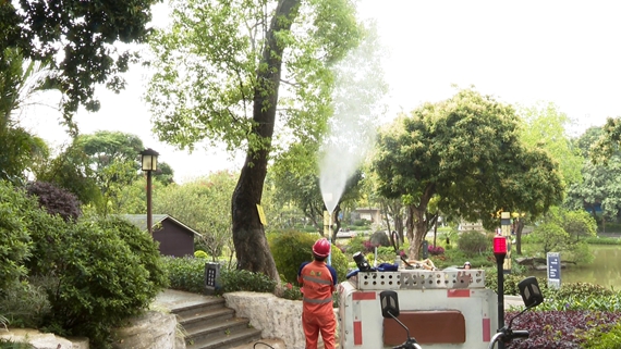 上午9时许,在北园公园湖边的香樟树旁,园林工作人员正操作高压喷雾设备,针对毛毛虫等主要虫害,对树木进行药物喷洒。药雾均匀附着在叶片表面,形成保护层,让植物更健康。