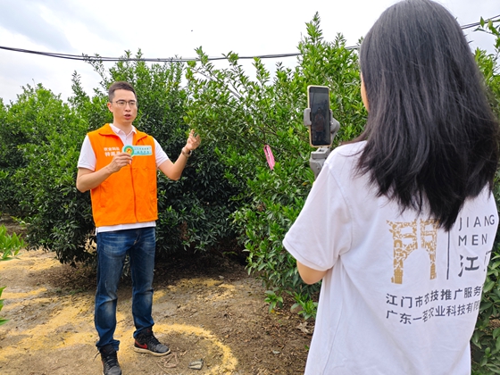 “大家好,我是主持人‘农技哥’,今天来到双水的新会柑种植基地……”在新会的田间地头,一部手机、一个三脚架,构成了广东一茗农业科技有限公司总经理林盛南的“移动办公室”。