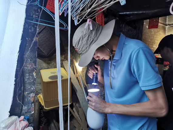 “您好,我们是蚊媒监测员,上门检查积水情况。”在城西社区,蚊媒监测组敲开居民家门,手持电筒、目光如炬,如同“侦探”般对阳台、厨房、卫生间等角落的各类积水容器进行细致勘查。“阿姨,您看这个花瓶里的水,水虽然不多,但3—5天就可以长出蚊子来了。”蚊媒监测员用手电筒照射积水,向居民现场讲解,并协助清理积水、刷洗容器,消除蚊虫孳生隐患。