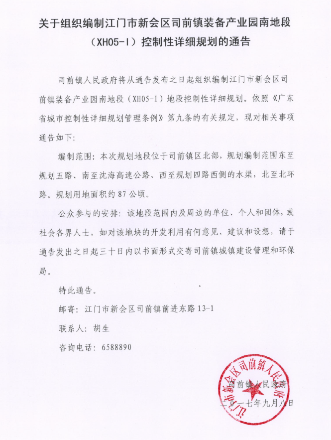 关于组织编制江门市燕雨直播 司前镇装备产业园南地段(XH05-I)控制性详细规划的通告