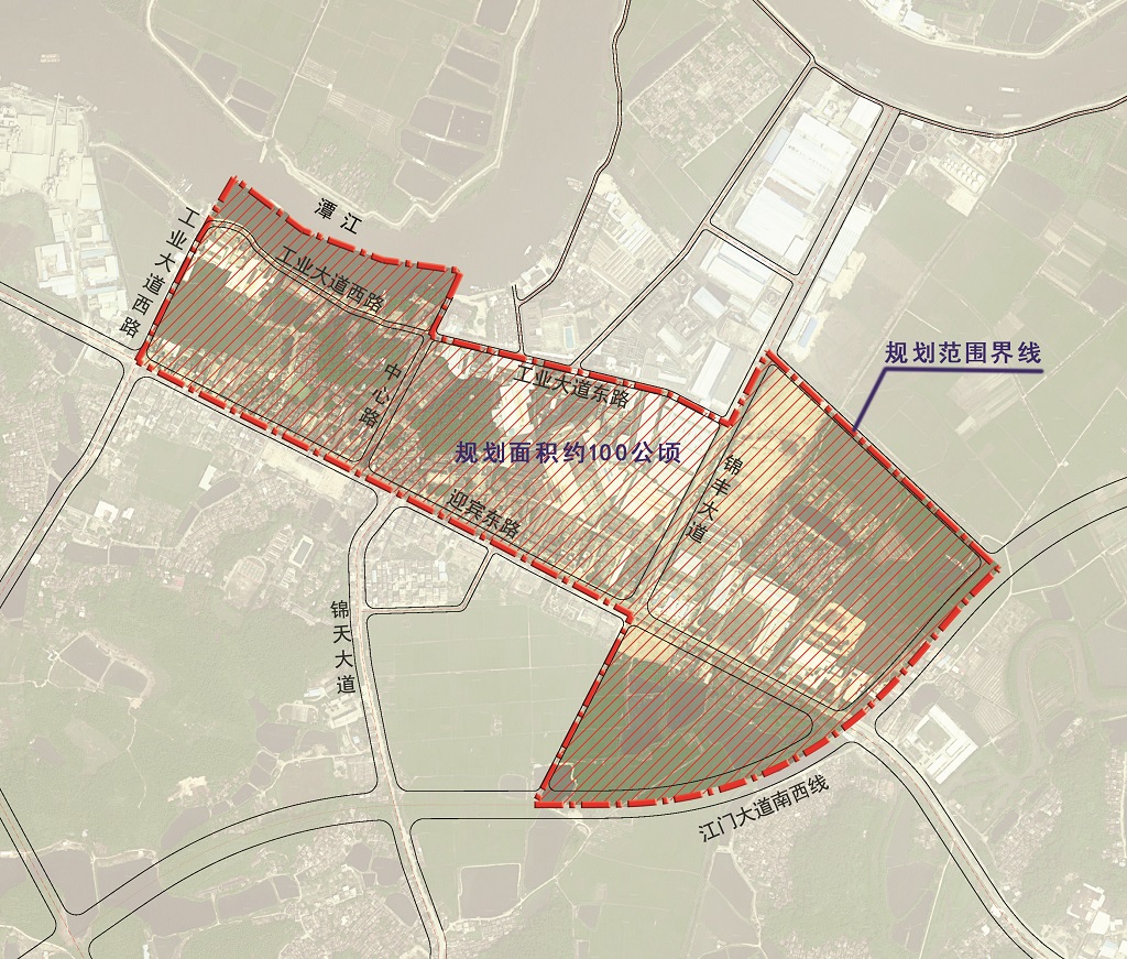 本次规划地段位于罗坑镇区东北部,规划编制范围东至江门大道南西线,南至迎宾东路、江门大道南西线,西至工业大道西路,北至工业大道西路、工业大道东路。规划范围面积约100公顷。
