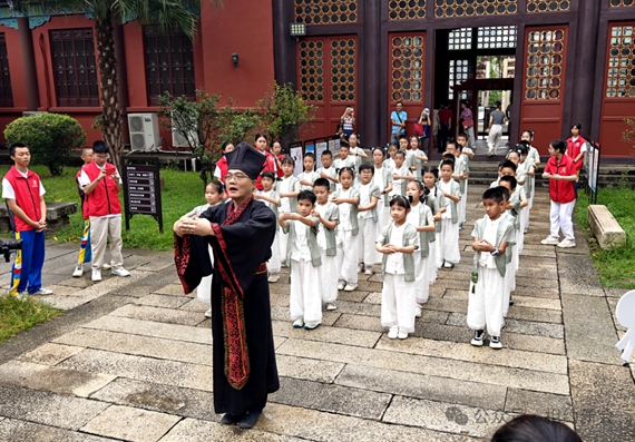 在开班仪式中,35位身着传统服饰的小学员们在新会学宫大成殿前,在老师的引领下,向孔子先师行拜师礼,表达了对古代圣贤的敬仰之情和对中华优秀传统文化的尊重。