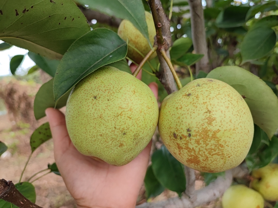 该农场种植的是改良后的沙梨新品种,与以往皮厚、肉硬的沙梨相比,果实的品质大大提升。目前,中熟品种已完成采摘,晚熟品种将于七夕节期间甜蜜上市。