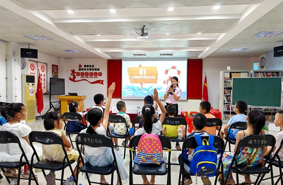 在防溺水安全教育课堂上,30多个孩子在老师的带领下模拟“溺水救人”。课堂生动有趣,帮助孩子们牢记防溺水的相关知识。