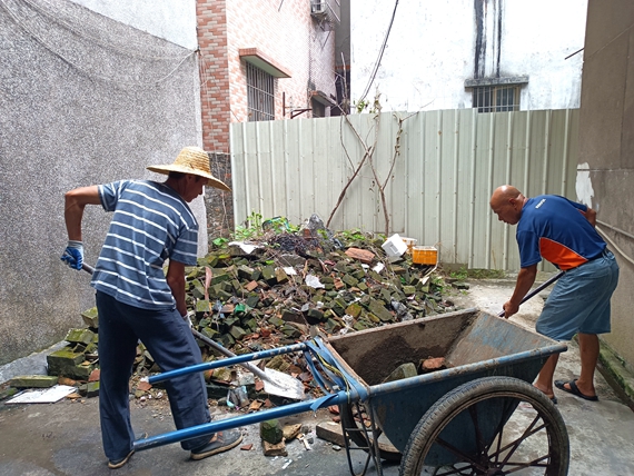 8月15日上午9时,清洁小队的组员们戴好手套、带上铁铲、推上小推车,去到两个清洁点位对杂物进行清理。大家齐心协力,清理出一车车的杂物。