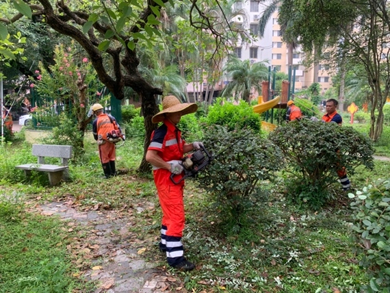 行动中,工作人员对小区内的花圃、公园、内巷平层的各个角落进行全面清扫,并将花圃内、墙角下长期堆放的杂物一一清理。近期气温高、雨水多,小区内的绿植快速生长,园林绿化工作人员抓紧进行绿化工作。江门新会北控绿润城市服务有限公司园林部绿化主管林锦照说:“我们主要进行了绿化修剪和清理,还进行了环境卫生的清扫、清洗、消杀等,防止蚊虫滋生。”