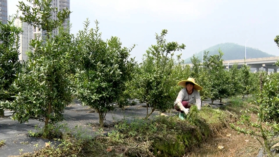 在古井缠龙山桔基地,工作人员正在疏通桔园沟渠,排除积水,清除杂草,对衰弱、受损枝条进行修剪和摘除。