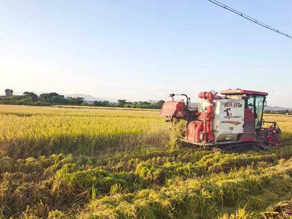 走进司前镇兴篁村永隆里,一眼望去满眼金黄,沉甸甸的稻穗随风摇曳,收割机正开足马力来回穿梭,阵阵轰鸣声中,割稻、脱粒、碎杆等工序一气呵成。